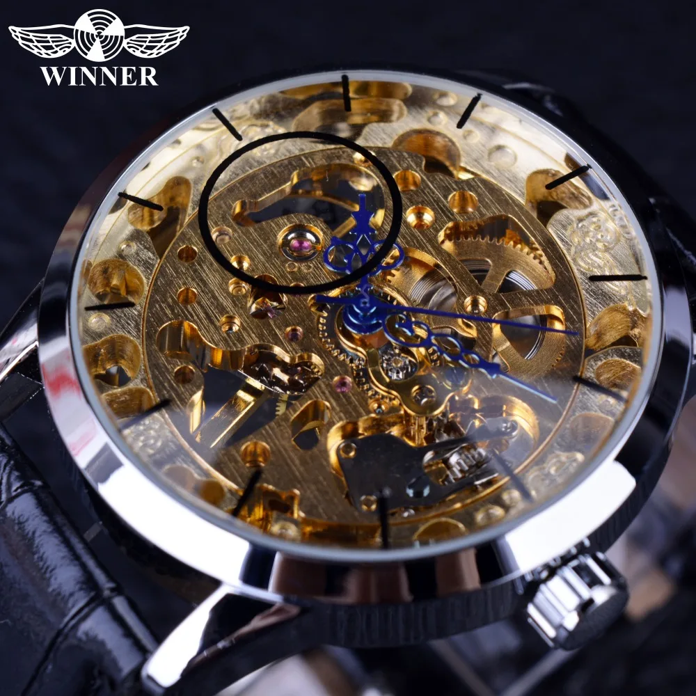 Часы Winner мужские, модные, повседневные, механические, с синими стрелками и золотым циферблатом