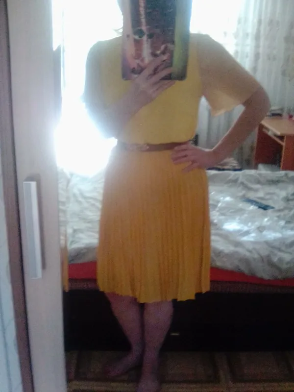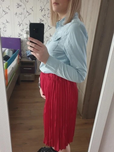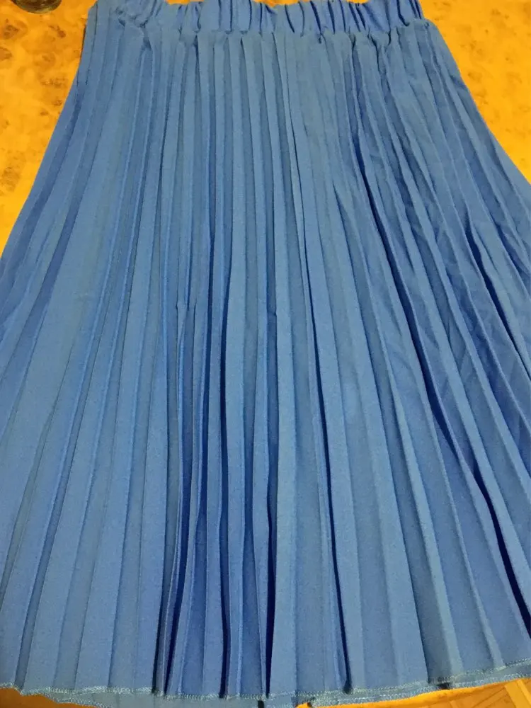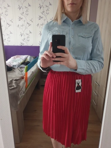Доставка заняла 1 месяц, юбка пошита хорошо, нитки не торчат. На рост 155 длина чуть ниже колена. Не просвечивает т.к. внутри синяя подкладка. На параметры 75-95 село хорошо, резинка не жмёт. Смотрится красиво.
