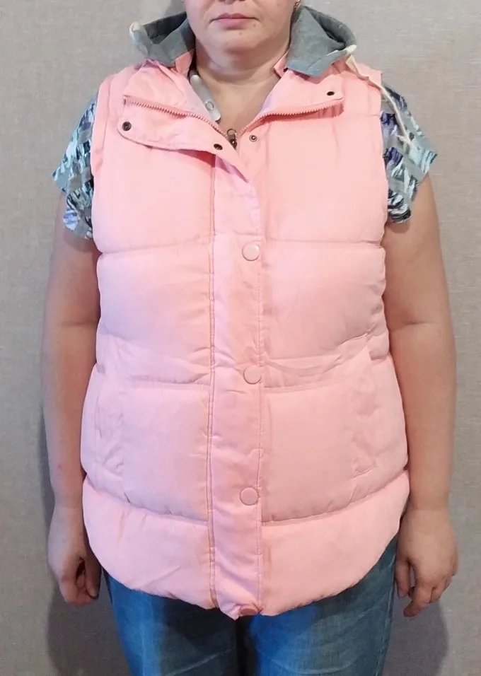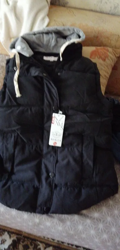 Сама жилетка выглядит очень классно! Она лёгкая и достаточно теплая, на осень будет отлично. Капюшон тоже тёплый и нормального размера, вполне можно надеть. Но. Размерная сетка вообще не соответствует. Брала не для себя, но человеку на указанный размер естественно не подошло и я оставила себе) На ог 105 примерно чуть великовата, можно с тёплой байкой спокойно одеть. Продавец отправил товар в последний день. Доставка долгая, больше 1,5 мес. +Пришла с дефектами, прошита красная нитка сбоку, хотя жилетка полностью чёрная и внизу какие-то белые пятна.. Деньги по спору должны вернуть, поэтому ставлю 4 звезды.