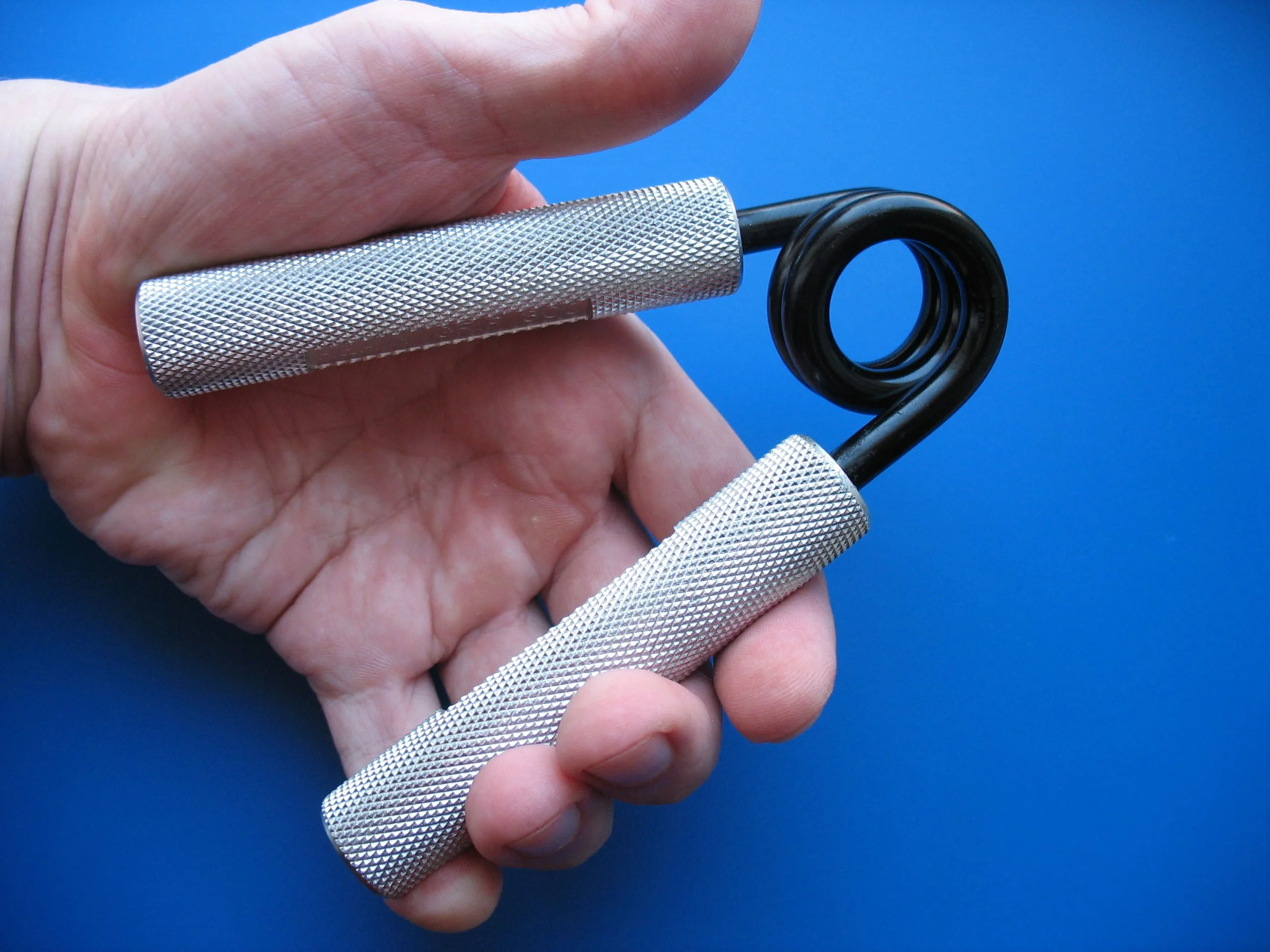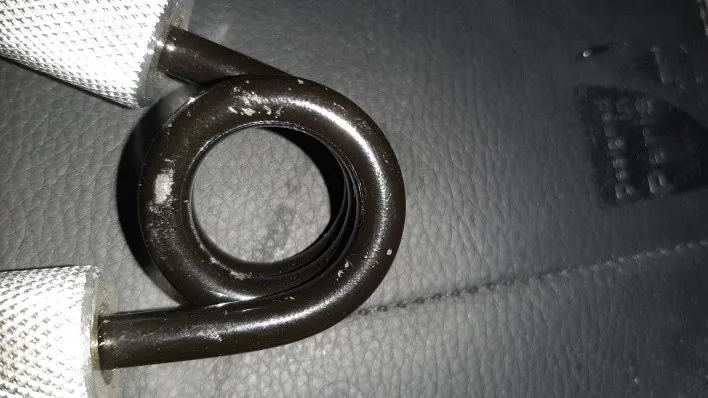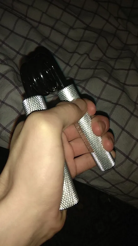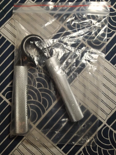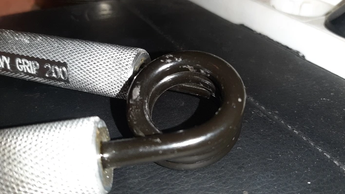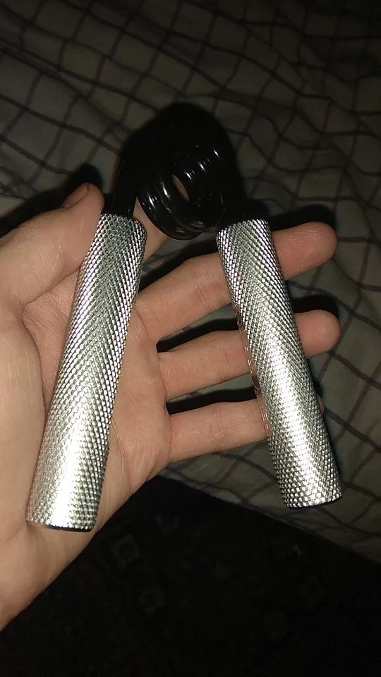 Эспандер очень тугой, еле сжимается на 1см. Изготовлен полностью из металла, ручки насажены туго и прокатаны сетчатым рифлением. Чем сильнее сжимаешь, тем сильнее рифление впивается в ладонь и пальцы. Главное чтобы не лопнули витки или не выскочили из ручек в момент максимального сжатия.