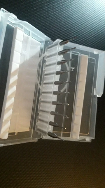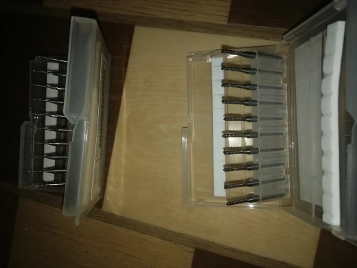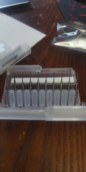 Хорошие фрезы, только быстро тупятся - одной хватает на 1-2 печатные платы примерно 100х150мм размера (отверстия, прорези, обрезка по контуру). Можно и больше плат на 1 фрезу, но качество уже падает. Расходный материал в общем. Благо цена соответствующая на них.