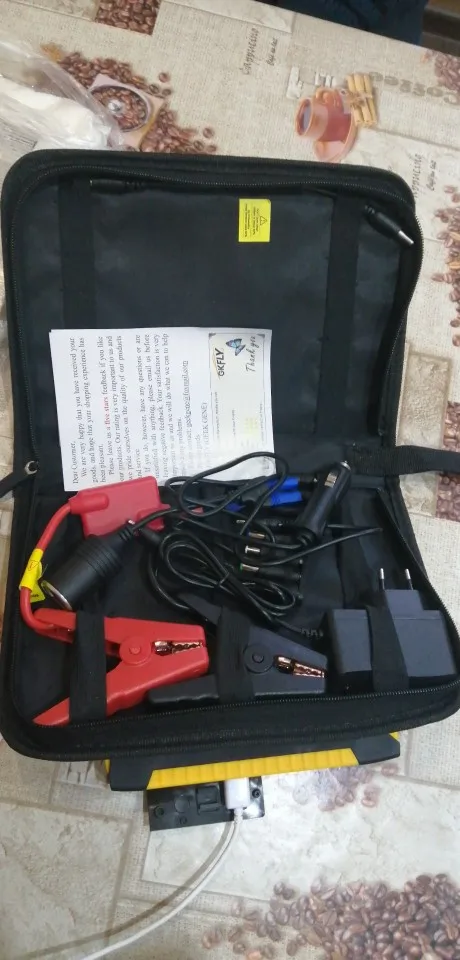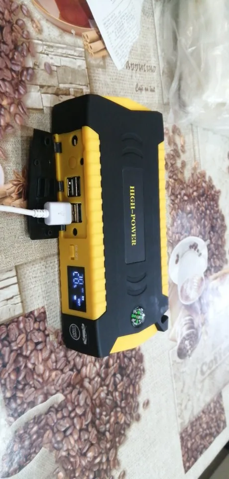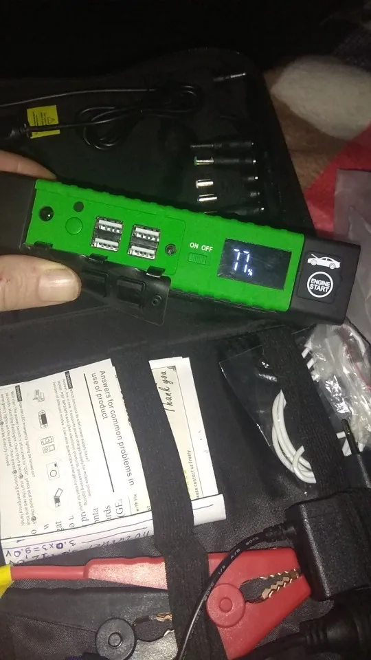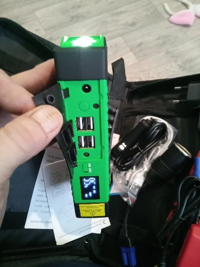 Пришёл быстро за 7 дней экспресс доставка Привёз курьер, работает отлично, HONDA C-RV завелся -15 градус без аккумулятора очень легко, попробовал несколько раз при этом зарядка упала всего 2 процента, от 100 упала 98, фонарик работает при нажатии около 5-и секунд, чтоб загорели боковые мигалки надо нажат 2 раза без паузы, некоторые пишут не хватает зарядки на один телефон, я скажу это не повер банк для зарядки телефона, ест повер банк намного дешевле, хотя это тоже работает как запасной источник энергии, доволен с покупкой, спасибо продавцу