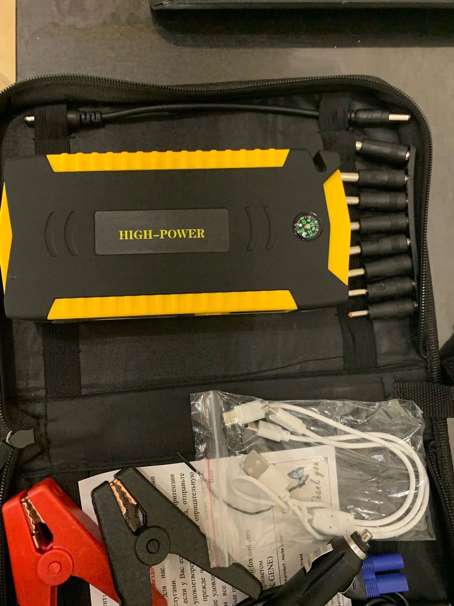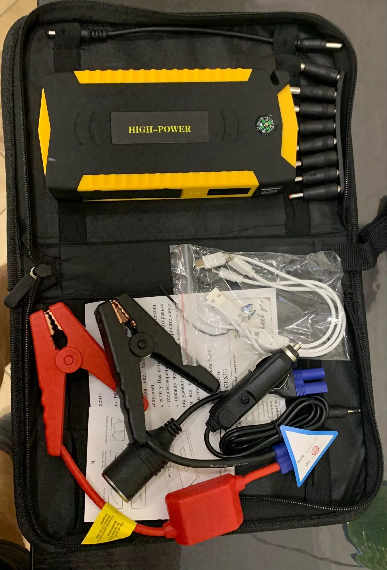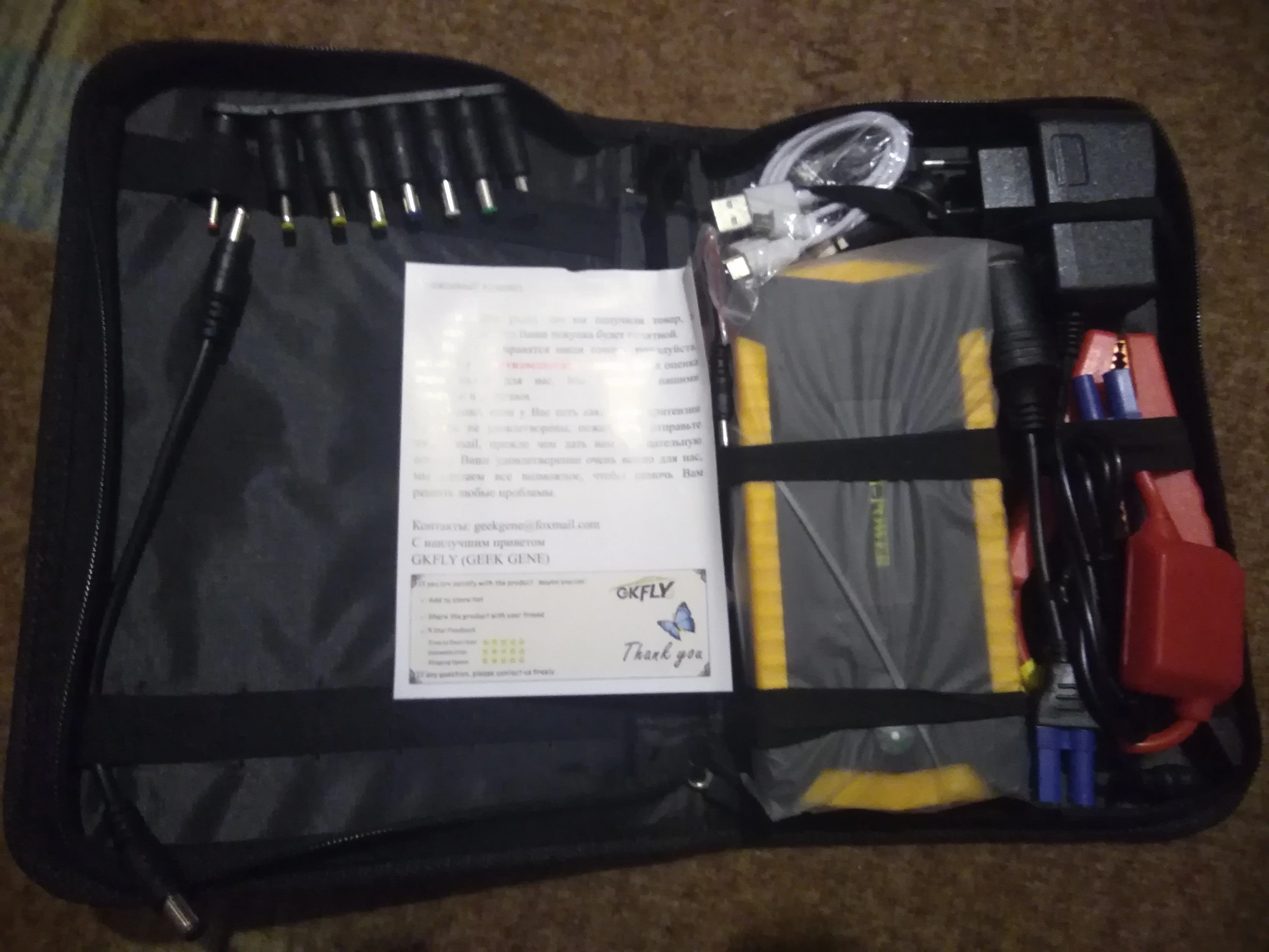 Получил можно сказать мгновенно. Качество достойное. Смартфоны заряжает. Фонари горят, табло работает, много переходников и прочих кабелей, есть даже встроенный нож. Прикольно. На авто не использовал - не было причины. Спасибо продавцу, рекомендую магазин.
