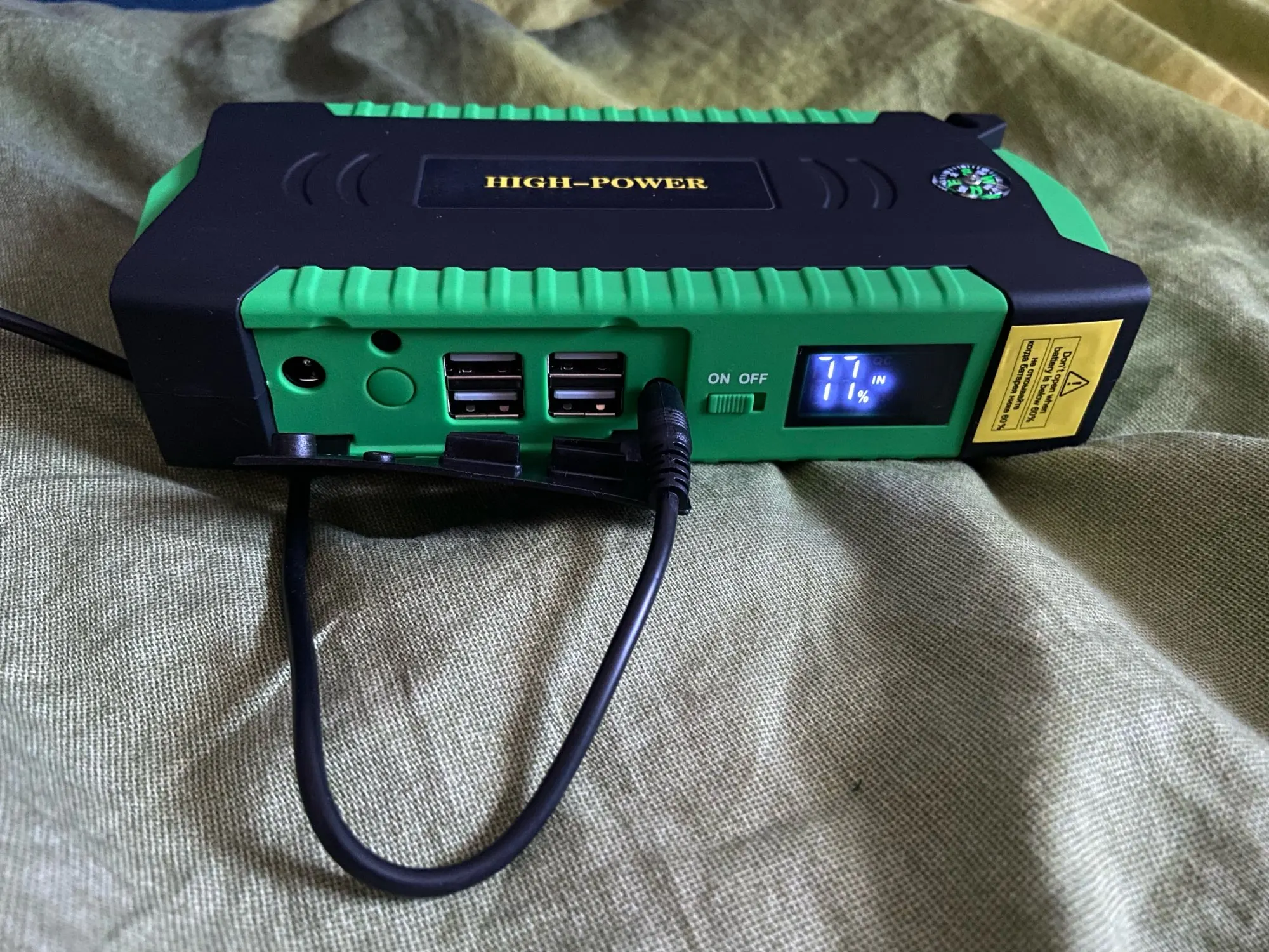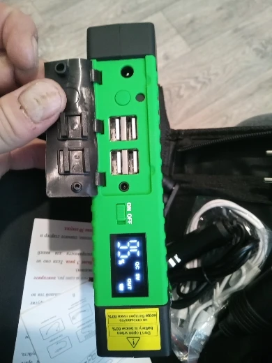 Только получив товар сразу пошел к машине. Заряд с коробки 91%. Подключил к проводам без аккумулятора и включил зажигание.Машина 2.0 дизель. Прогрел свечи и начал крутить. Стартер сделал 1 оборот и замер. И так 2 раза. Далее попробовал без прогрева свечей 2 раза - то же самое. Посмотрев на бустер на нем было 4%. Нажал выключить/включить стало 41%. Попробовал снова без прогрева свечей и вуаля - двигатель запустился. После всего этого вспомнил, что пиковый ток 600 А подаётся всего несколько секунд. Бустер рабочий - впринципе за эти деньги доволен. После всех манипуляций остался 31%. Объема хотелось бы больше. Также сразу отпала заглушка, она просто выпала из паза, вставил назад. Зарядку мобильника и ноута не проверял так как брал специально для машины на зиму. Далее время покажет.