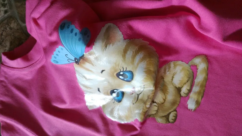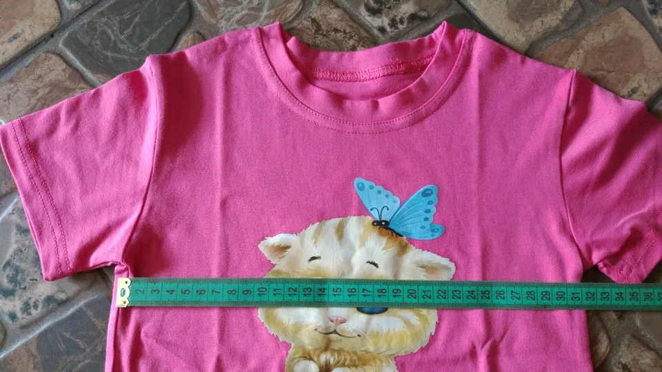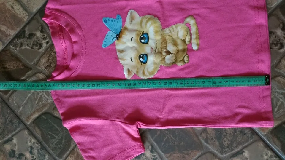 Заказала размер 3Т. На этикетке маркировка 100. Замеры на фото. Дочка ростом 100см, ей эта футболка будет,думаю,большая и широкая. Приложила футболку,которую дочка сейчас носит поверх заказанной. На фото видно что заказанная больше. Футболка скорее тонкая, не очень плотная, приятная на ощупь. Цвет как на фото. Котик наклеен(на фото видно как отсвечивает), очень милый! Запаха нет, нитки не торчат