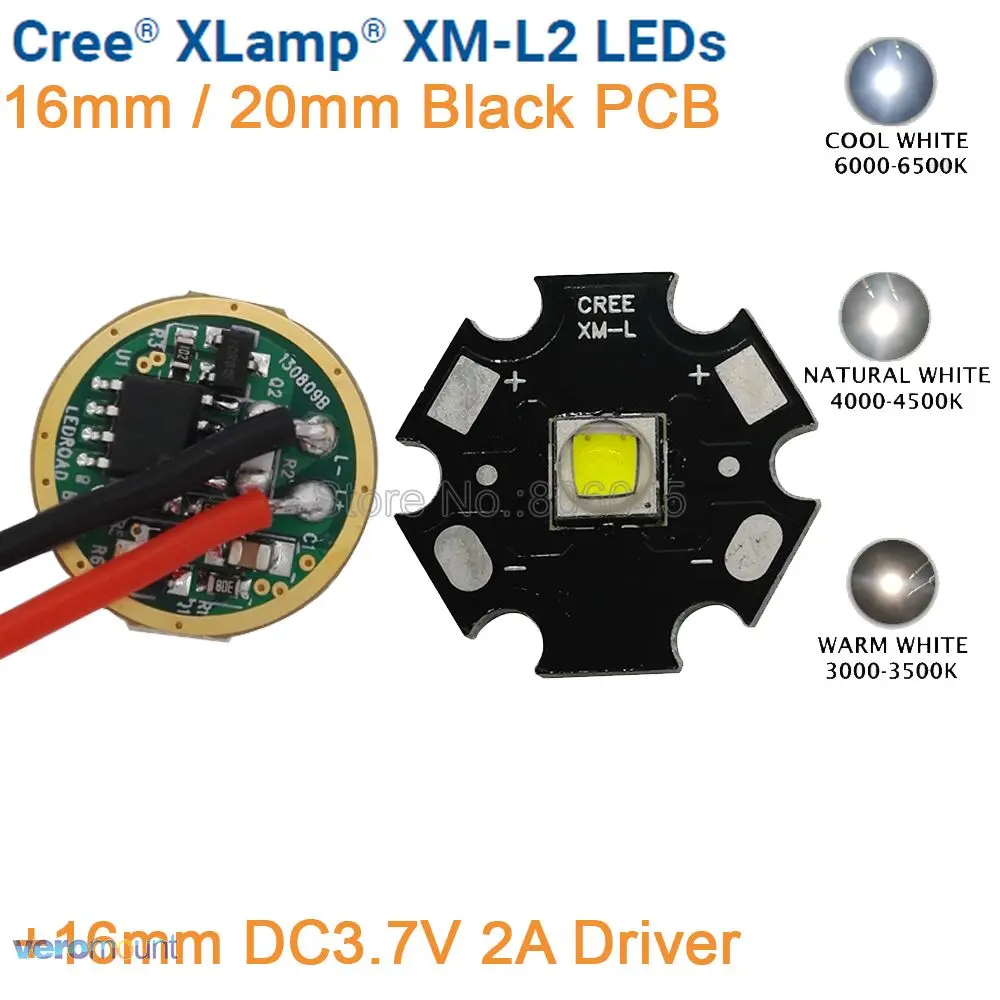 Светодиодный излучатель CREE XML2, холодный белый, 6500 К, нейтральный белый, 4500 к, теплый белый, 3000 К, 16 мм, 20 мм, черный, PCB + DC3.7V, 2A, 16 мм