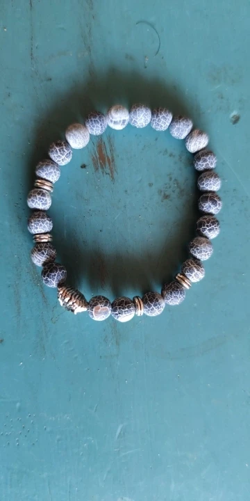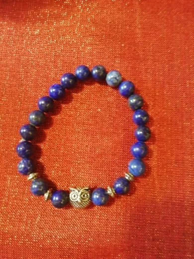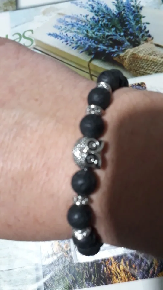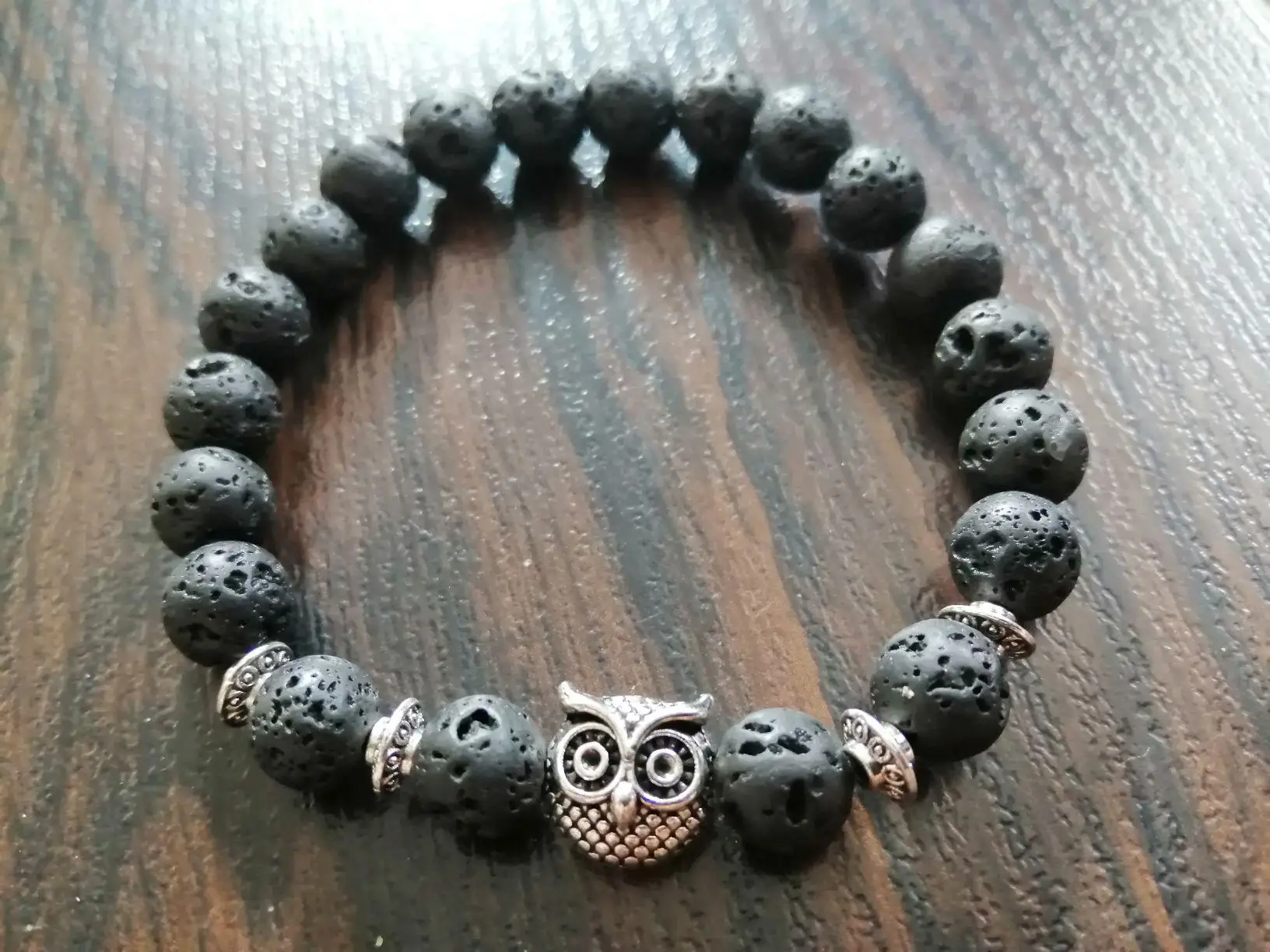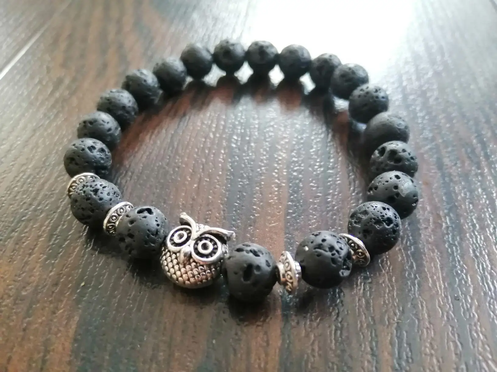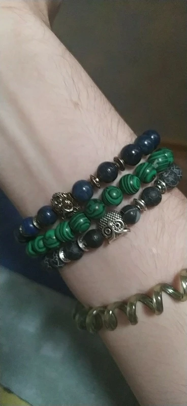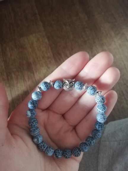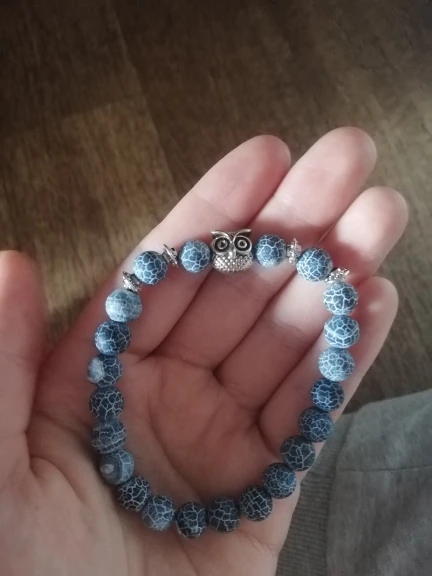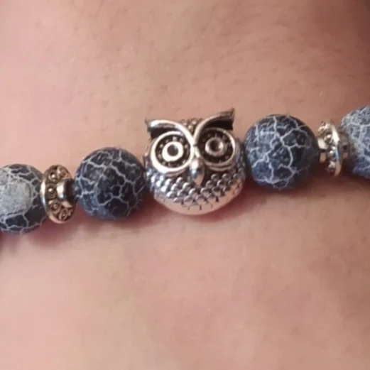 Браслет получила через месяц. Заказала больше из-за совы в центре, а камень - лаву взяла наугад. Сейчас думаю, что камень надо было бы другой взять - лава очень пористая и в этих порах при ношении будет постепенно накапливаться грязь, которую потом будет не удалить из этих пор, так как их очень много разного размера. Бусины на тянущейся леске, мне немного великоват (окружность моей кисти 16 см). В дальнейшем браслет буду переделывать под свою руку и, наверное, с другими бусинами.