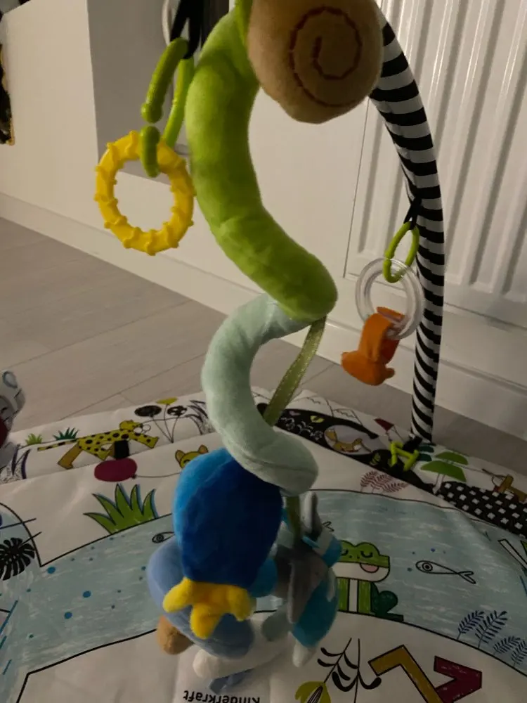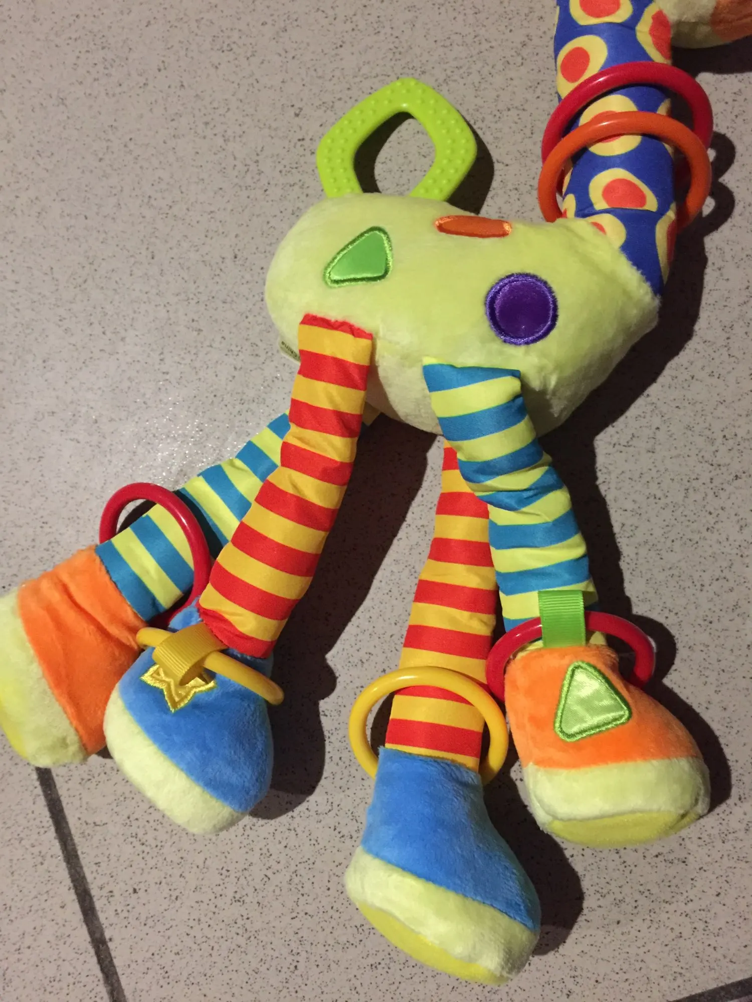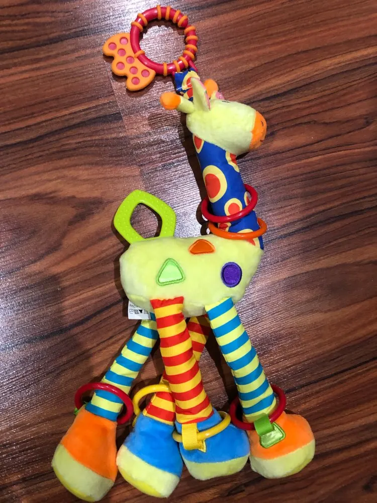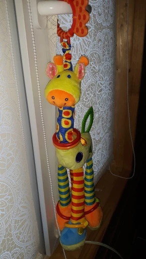 Жираф вообще клевый. Во всех лапах и в ушах шелестелки. В голове пищалка а в теле погремушка. Хвост и на голове большое кольцо сделаны из резины (типа прорезыватель для зубов) можно грызть. На шее и лапах кольца пластиковые. В общем жираф очень хороший. Мы используем его в автомобиле, очень увлекает ребёнка.