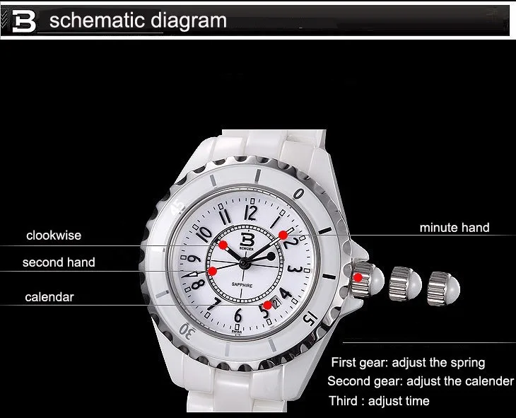Бренд: BINGER Механизм: кварцевый механизм Состав металла:Керамика Кристалл: сапфир Чехол Размеры: 23 мм диаметр Тип ремешка: вольфрамКерамика Посылка: накрыть пузырчатой пленкой и упаковать в подарочную коробку Бингер. Вместе с инструкцией. Внешняя коробка также покрыта пузырчатой пленкой. Мы обещаем, что часы не будут повреждены при транспортировке