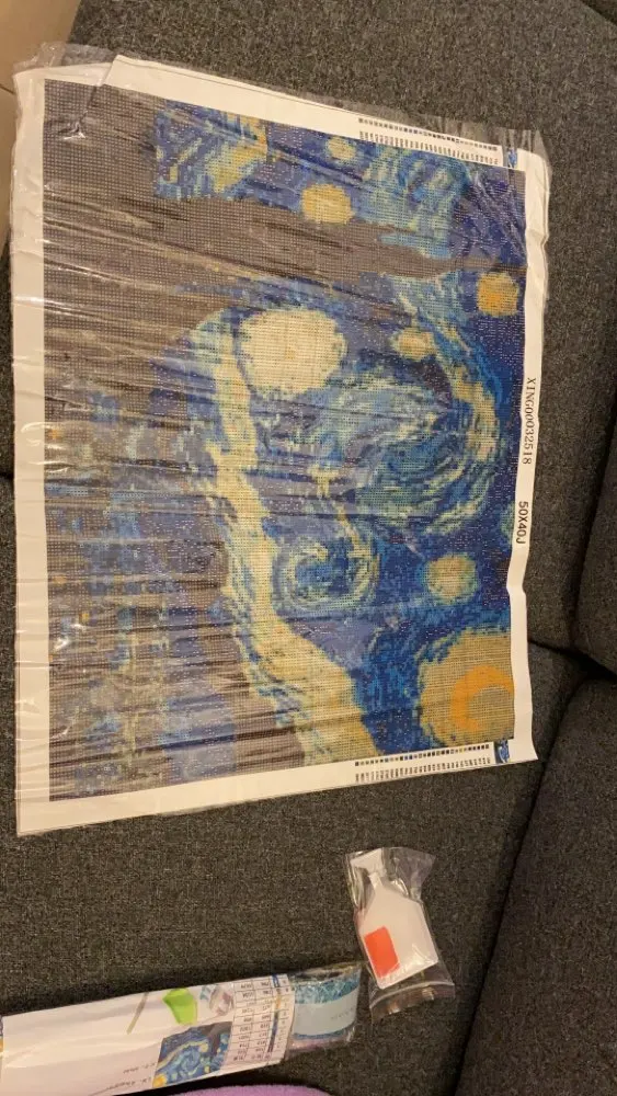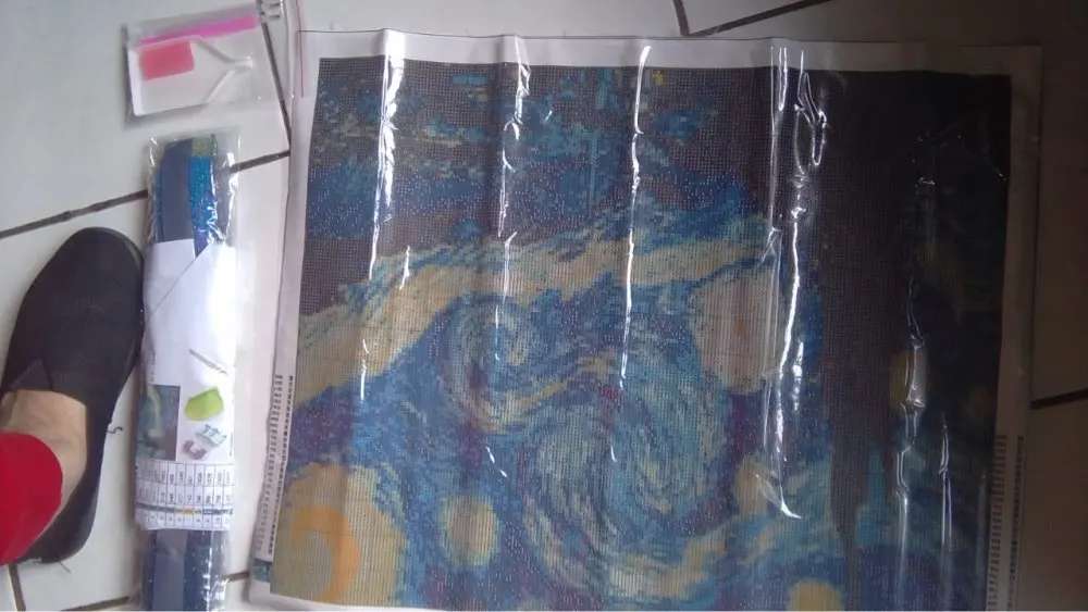 Пришло очень быстро, около двух недель. Картина была очень хорошо запакована. В упаковке было: тканевая картина с пластиковой пленкой, квадратные кристаллы, две «ручки», подушечка с клеем и одно маленькое судно. Ещё в комплекте есть маленькие пакетики, но их не много.