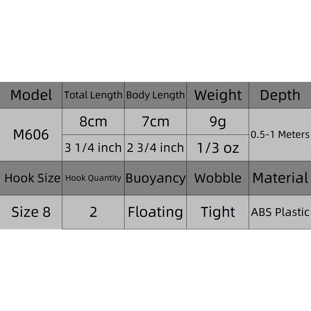 Приманка рыболовная wLure M606, 9 г, 8 см, 0,5 м, 9 цветов на выбор, 2 крючка из черного никеля 8, с твердыми глазами