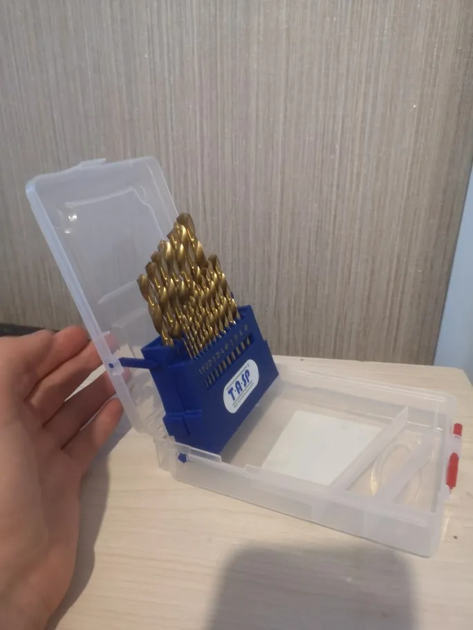 Почему-то набор пришел в двух частях. отдельно коробка с маленькими сверлами и пакетик с большими. по виду всё нормально, но в работе в ближайшем будущем проверить не удастся. Понравилась быстрая курьерская доставка. До Тюмени за 6 дней
