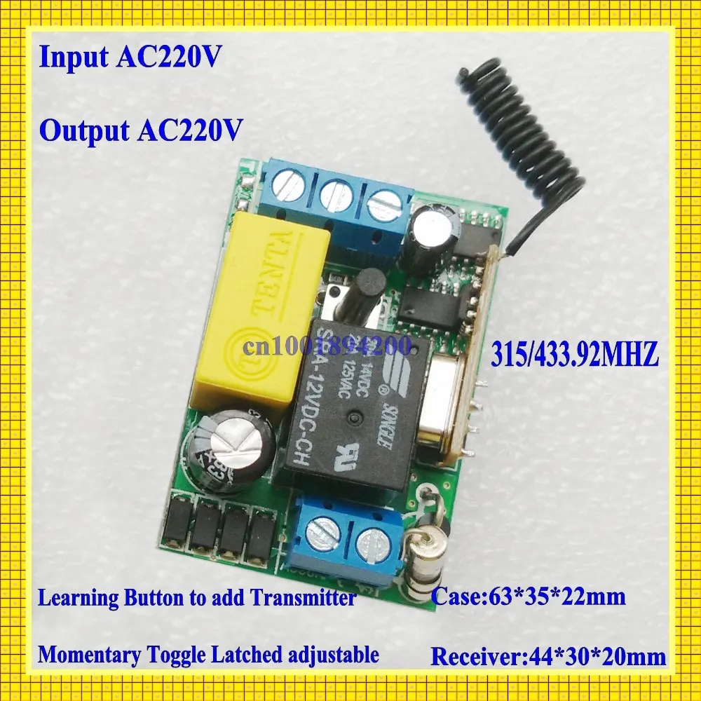 1. Рабочее напряжение:AC220V (вход AC220V выход AC220V)2. Максимальный ток: реле 10A(Имеет лучшую нагрузку менее ac220в 600 Вт)3. Канал: 1CH4. Рабочая частота:315MHZ/433MZH опционально, оставив массажЧувствительность приемника: -105 дБРабочая температура: -10'C - + 60'CВыход: Мгновенный. Переключения. Защелкивается регулируемый