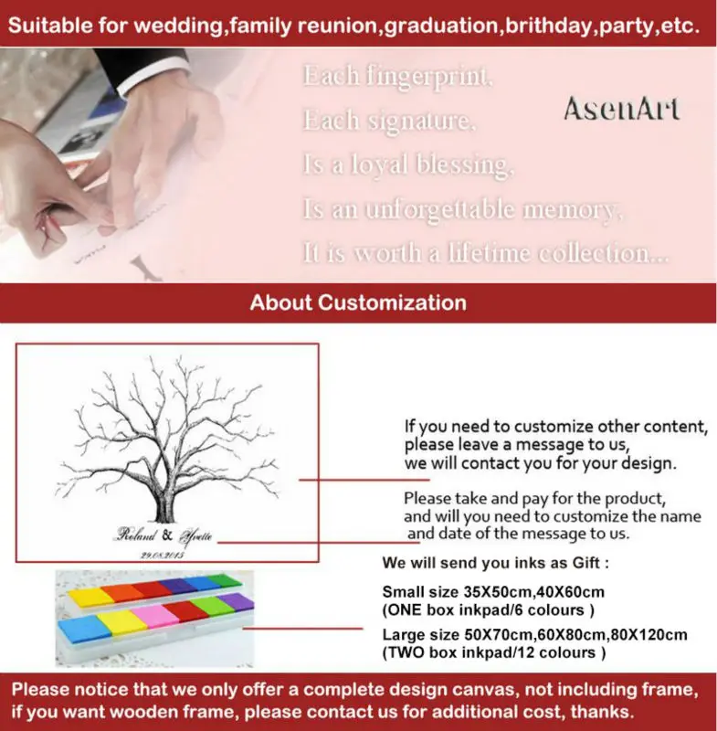 Примечание: Если вам нужно напечатать ваше имя и дату, пожалуйста, оставьте нам сообщение. Или мы вышлем его без имени и даты. После того как вы получите продукт, вы можете разработать его самостоятельно. Характеристика: 1. Уникальная Гостевая книга Альтернатива. Очень уникальная идея, если вы ищете что-то особенное и особенное. 2. Легко наносится. Просто оставьте свой отпечаток пальца на нем с чернильными накладками, и вы можете спроектировать то, что вам нравится. 3. Это дерево с изображением большого пальца идеально подходит для многих случаев. Свадебный День Рождения Выпускной детский душ или семейные праздники. 4. Чернила легко смываются с пальца. Материал: холст (более прочный, чем бумага) Размер: 35*50 см (менее 100 гостей) отправляется с одной inkpad 40*60 см (менее 130 гостей) отправляется с одной inkpad 50*70 см (менее 160 гостей) отправляется с двумя чернилами 60*80 см (менее 200 гостей) отправляется с двумя чернилами 80*120 см (менее 300 гостей) отправляется с двумя чернилами