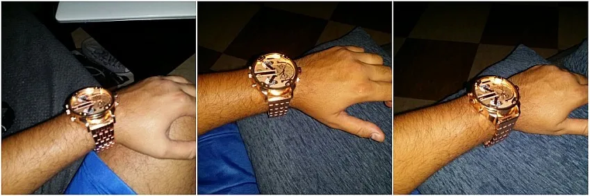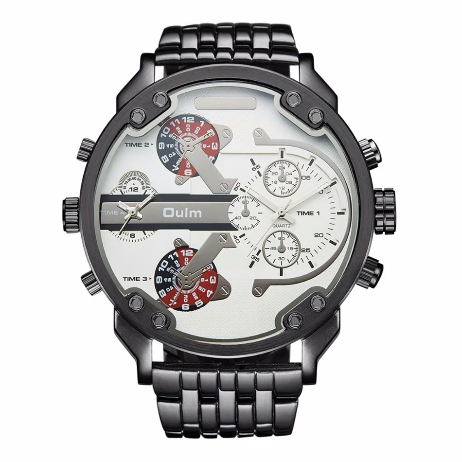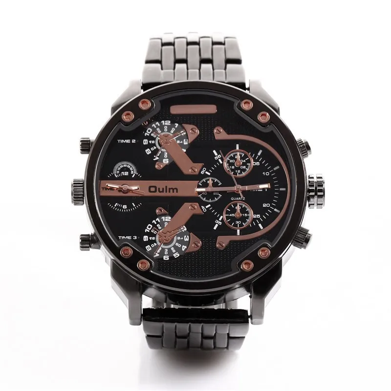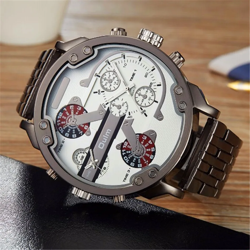 Мужские кварцевые часы Oulm, из нержавеющей стали, с двойным часовым поясом, большого размера, с золотым циферблатом, подарок на день рождения, 3548
