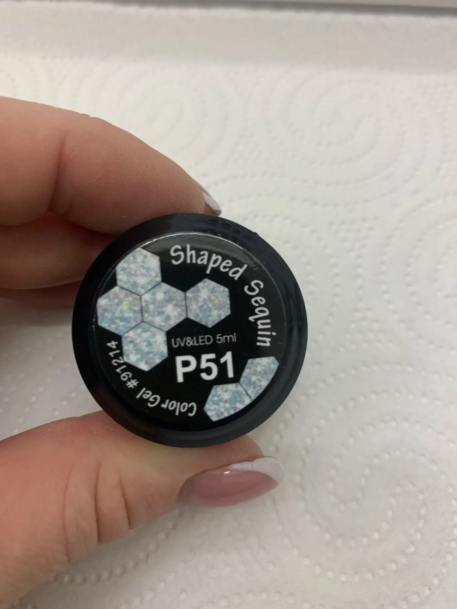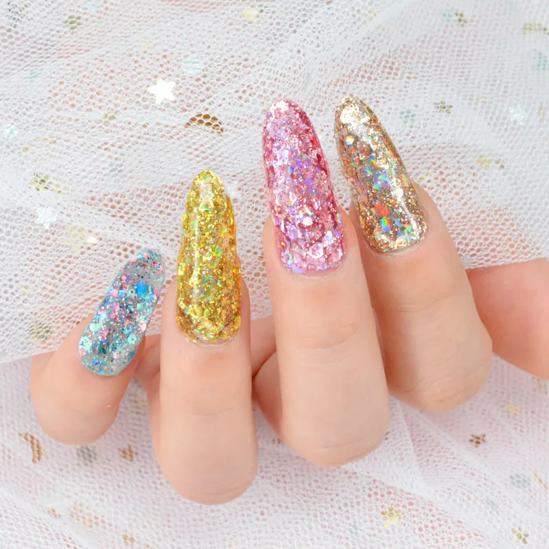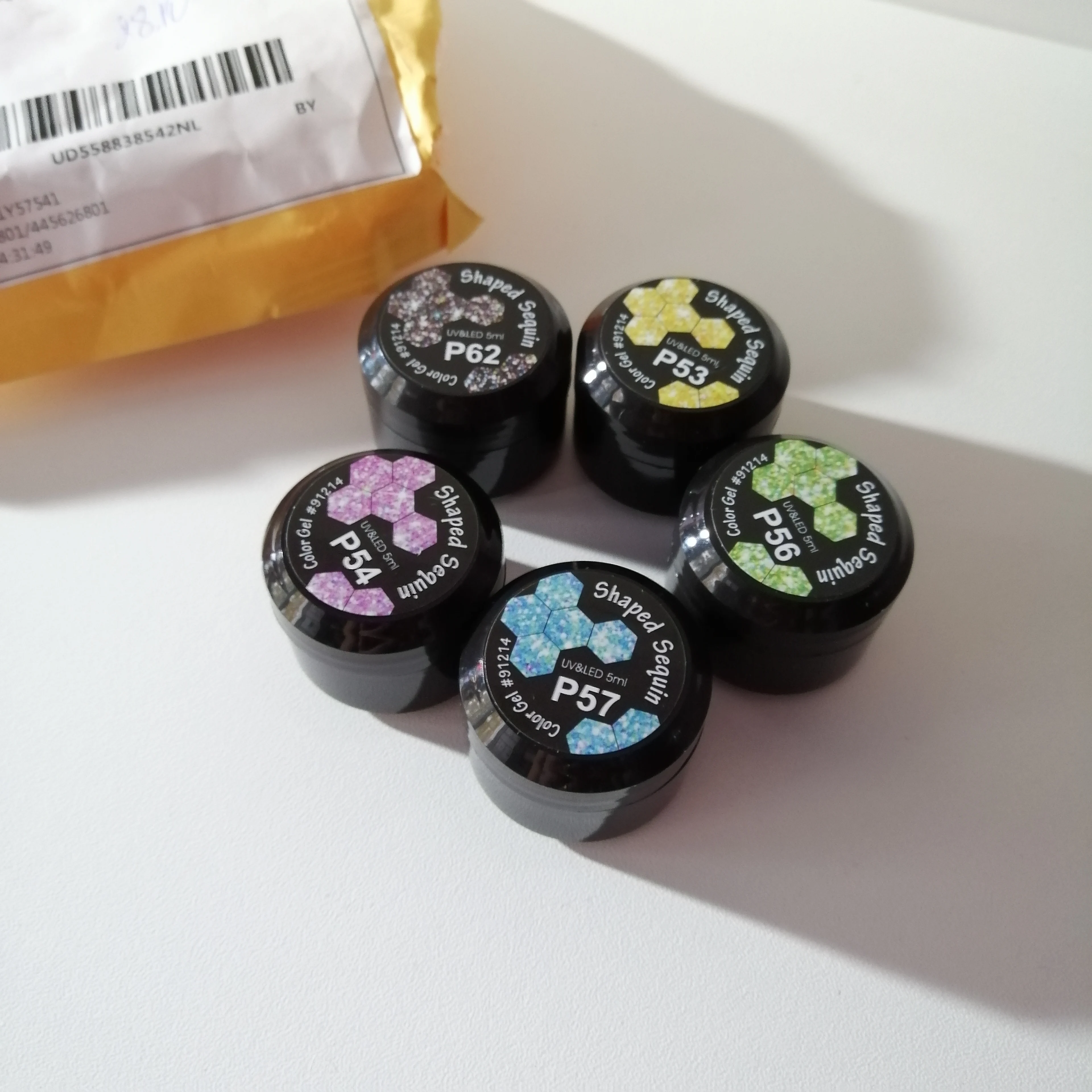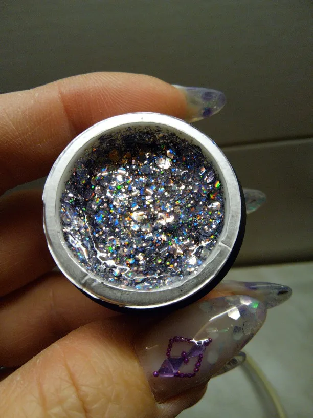 Очень красивые. Густые, довольно много блёсток замешано в геле. P61 такой же, как на картинке, там голубые и розовые шестигранники разных размеров и мелкие блёстки. А P59 немного не такой насыщенный цвет, как у продавца. Шестигранники там серебристые, голографические, а мелкие блёстки розовые.