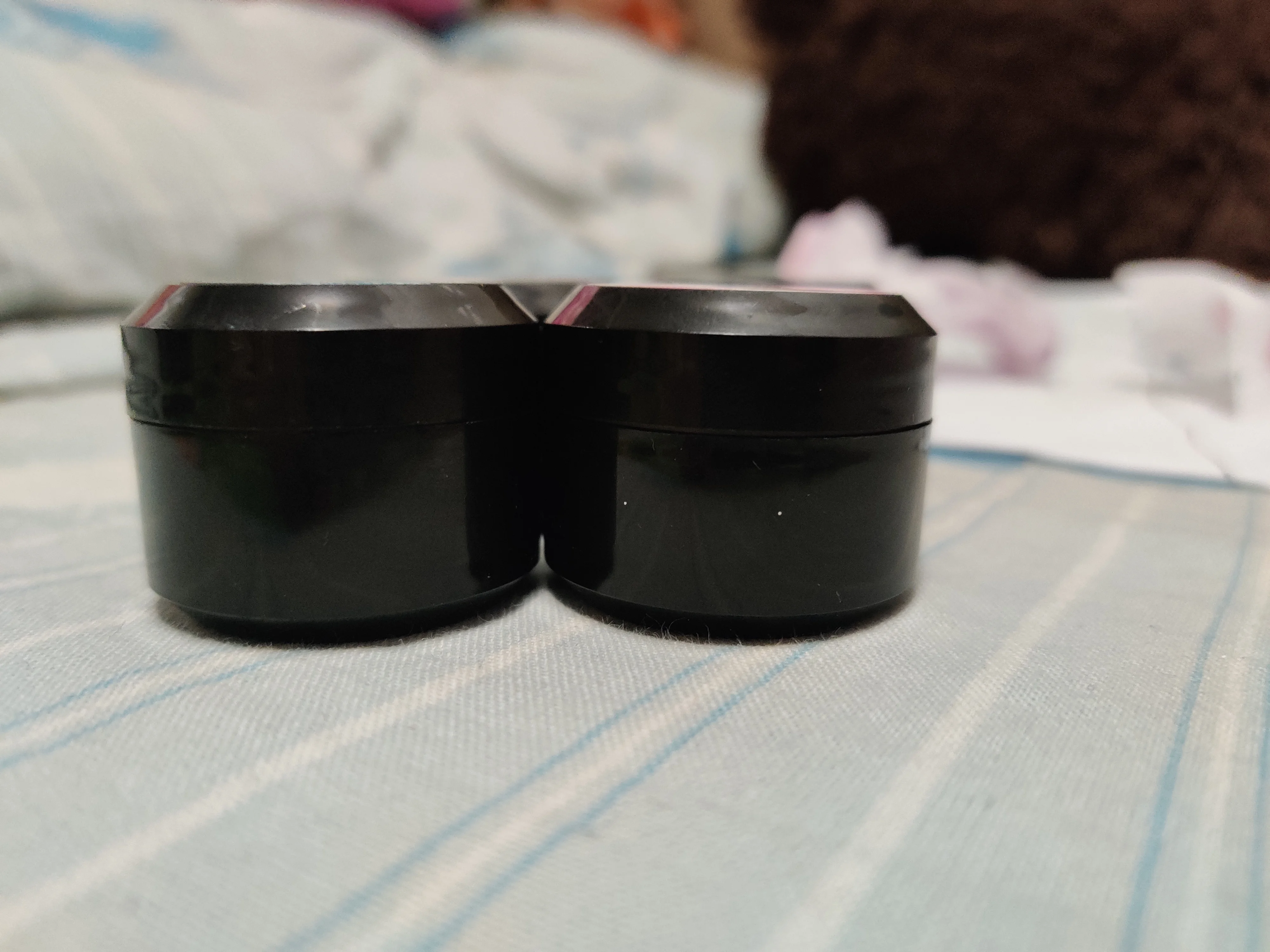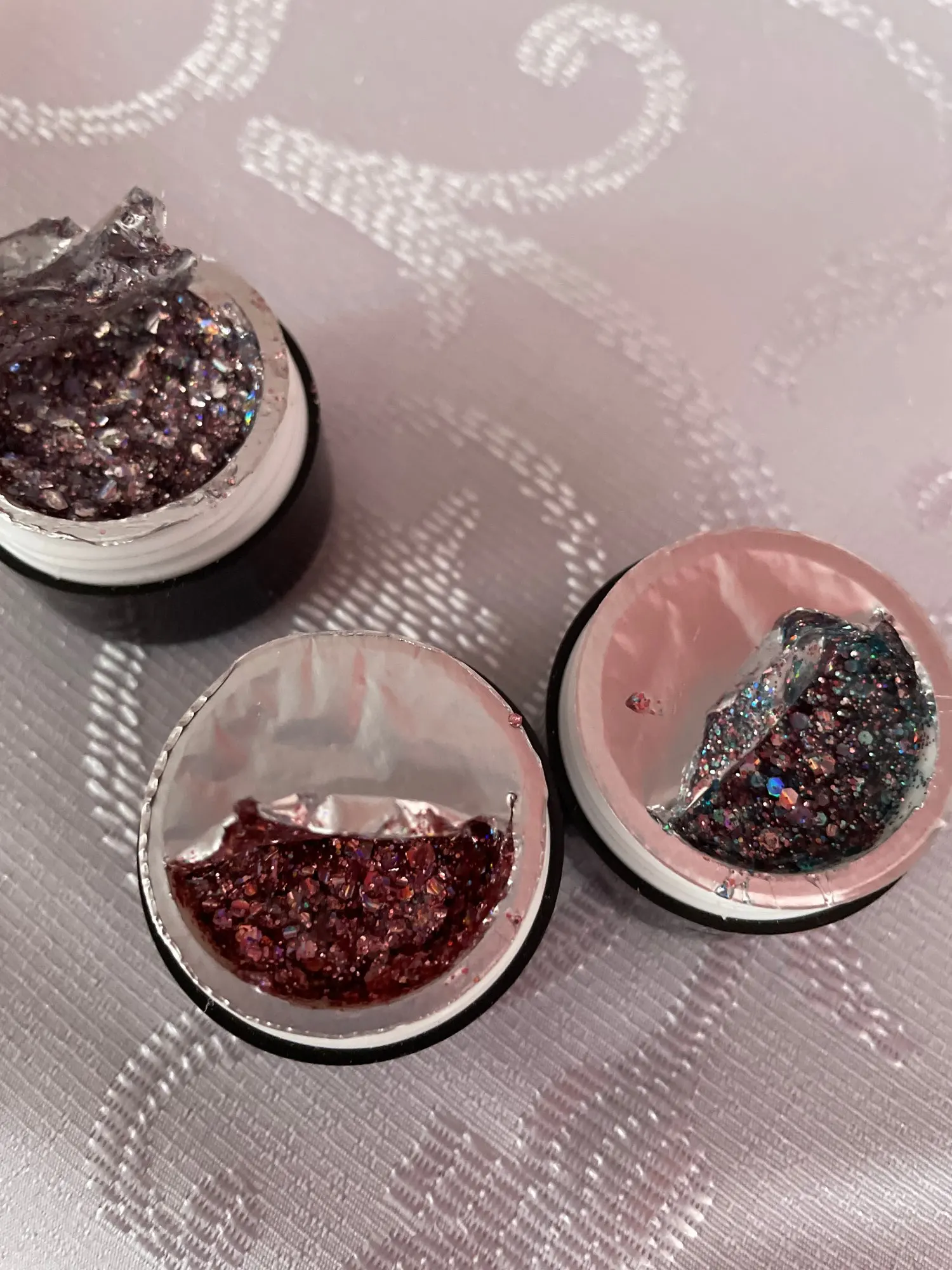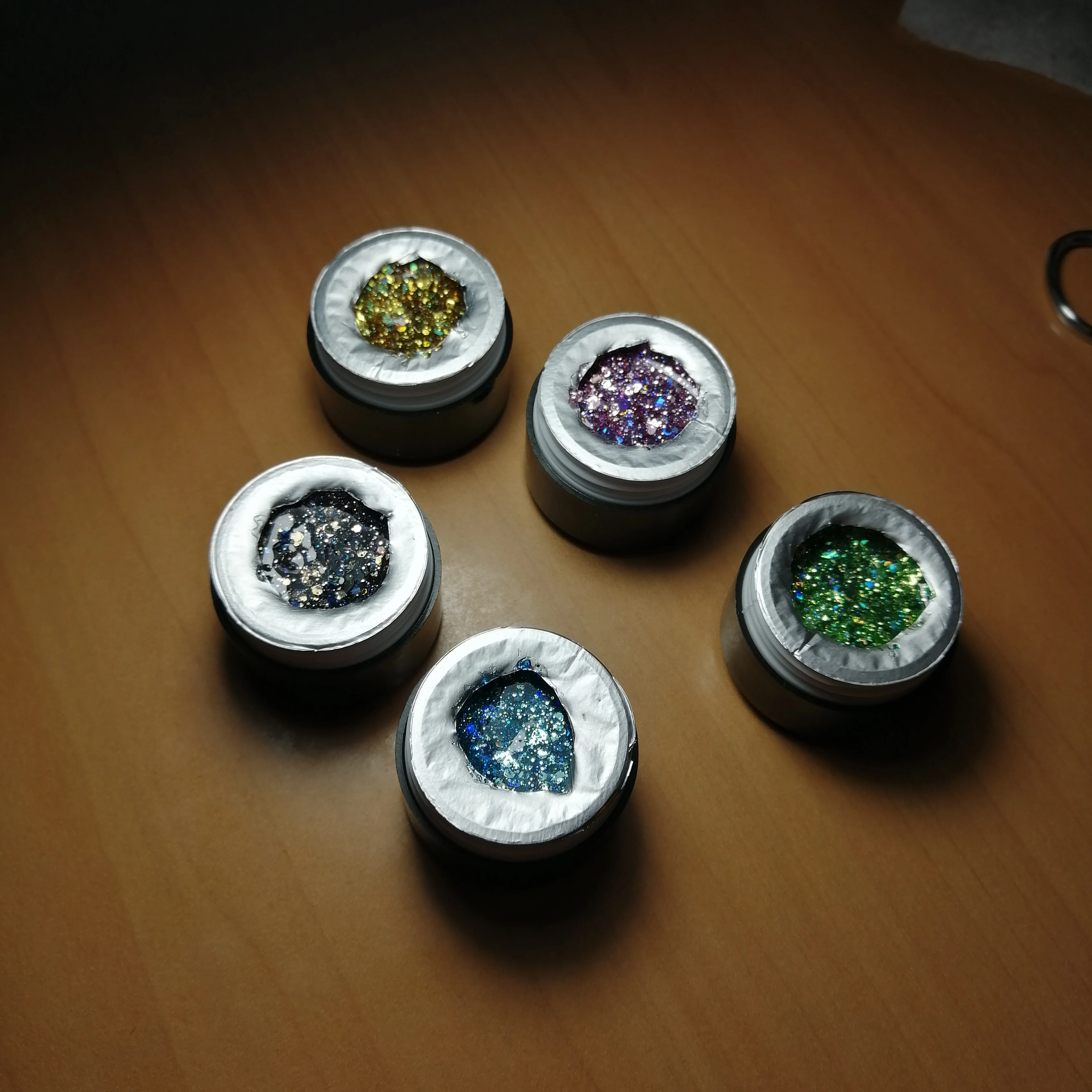 Очень красивые. Густые, довольно много блёсток замешано в геле. P61 такой же, как на картинке, там голубые и розовые шестигранники разных размеров и мелкие блёстки. А P59 немного не такой насыщенный цвет, как у продавца. Шестигранники там серебристые, голографические, а мелкие блёстки розовые.