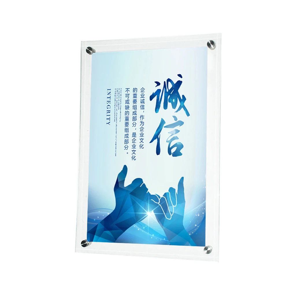 <1> Материал: этоСовременный настенный акриловая рамка для плаката cТолщиной 3 мм и одной акриловой панелью толщиной 5 мм, которая удерживается настенными креплениями, расположенными в четырех углах.