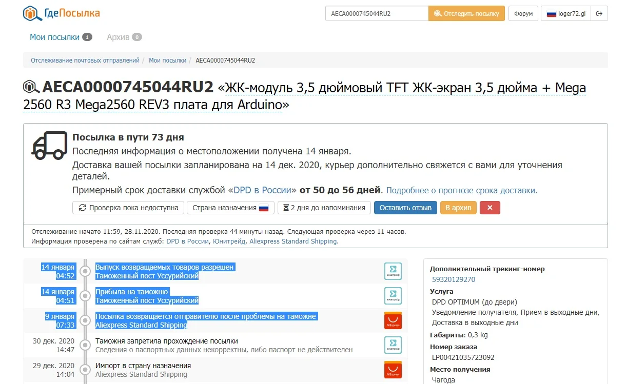 Доставка чуть меньше месяца. Упаковано отлично, в жесткую картонную коробочку и антистатический пакет отдельно Ардуинка, отдельно Дисплей. Ардуинка шьется после загрузки драйвера driver_ch340_341_arduino.exe . Дисплей пока не включал, но качество изготовления вселяет надежды. Покупкой доволен.
