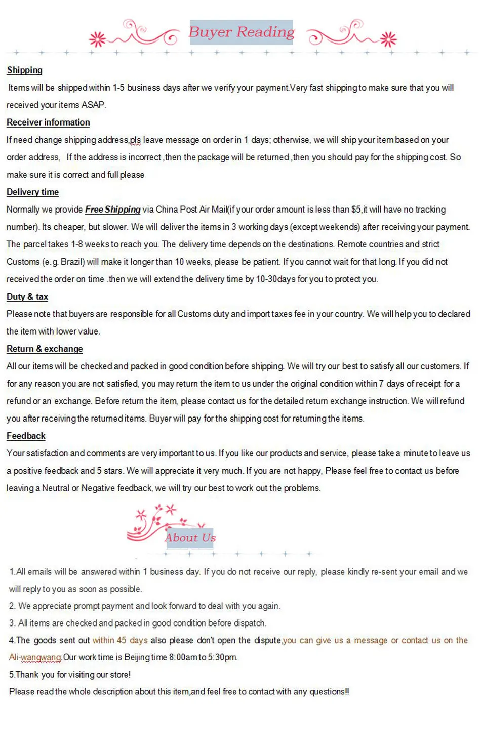 Пожалуйста, дайте нам знать, прежде чем оставить отрицательный отзывы или 1 точку, 2 точки ниже или открыть любые споры, пожалуйста, дайте нам возможность решить любые Проблемы, и мы постараемся сделать все возможное, чтобы удовлетворить ваши потребности