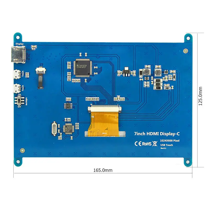 7-дюймовый стандартный дисплей, СВЕРХЧЕТКОЕ разрешение 1024x600Емкостный сенсорный экран, максимальная поддержка 5 точек касанияПоддержка управления подсветкой самостоятельно, может выключить подсветку для экономии энергииПоддержка стандартного интерфейса HDМожет использоваться в качестве общего назначения для HDMI-Display s, например, доступа к компьютеру-HDMI в качестве дополнительного дисплея (разрешение на выходе можно регулировать до 1024X600)В КАЧЕСТВЕ ДИСПЛЕЯ raspberry pie, поддержка Raspbian, Ubuntu, Kodi, win10, IOT, одно касание, Бесплатный дискИспользуется в качестве компьютерного монитора, поддерживает win7, 5-точечное касание системы win8 (XP и более старая версия системы single touch), Бесплатный дискРазмеры: 164,9*124,27 (мм)