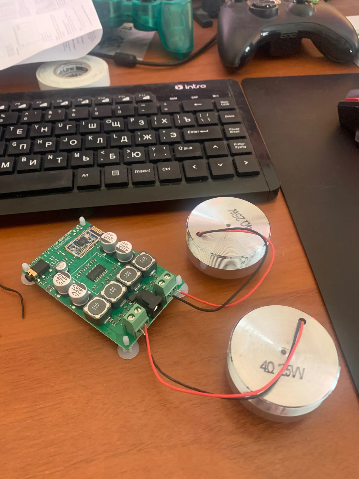 Товар дошел до Минска на удивление быстро. Продавец так же указал цену на посылке в 5$, благодаря этому не пришлось платить таможенный налог на товар, за что огромное спасибо! Динамики работают прекрасно. Из минусов разве что довольно тонкие и очень короткие провода от динамиков, а так же коротковатый провод от блока питания. Блютуз работает прекрасно.