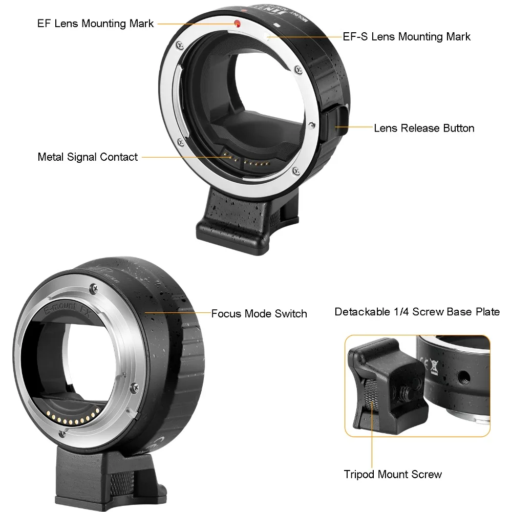 ЦзинтуБрендЭлектроника нового поколенияАдаптер крепления объективаJT-EF-NEXIIВ основном используется для подключения'Объективы Canon серии EF для камер Sony серии NEXС E-креплением. Между тем,ЦзинтуИспользуетНовый электронныйТехнология, которая может сделать диафрагму точно выровнять через адаптер и отрегулировать для автофокуса. Улучшает удобство управления объективом серии Canon EF на корпусах Sony micro-single с электронным способом. Кроме того, отверстие для отверстия адаптераОснован на полнокадровой камере NEX,Которые помогают идеально поддерживатьДля полнокадровых камер Sony NEX A7 и A7R A7II