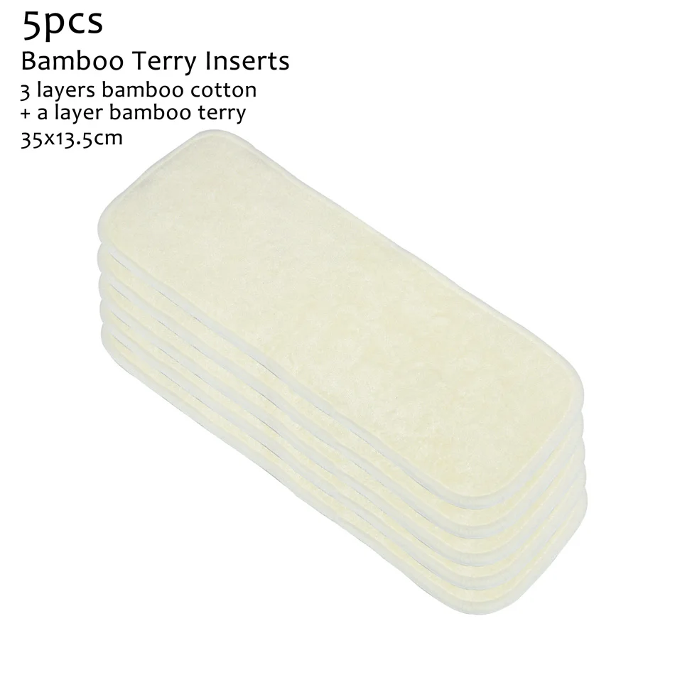 3 слоя бамбукового хлопка + слой бамбукового махрового Высокая впитываемость, многоразовый и прочный Бамбуковый махровый материал сохраняет бэббум сухим, тем временем помогает впитывать больше. Размер: 35x13,5 см подходит для всех наших подгузников одного размера Ежедневное использование: один чехол/карман + одна бамбуковая махровая вставка Ночное использование: одна крышка/карман + 2 бамбуковые махровые вставки