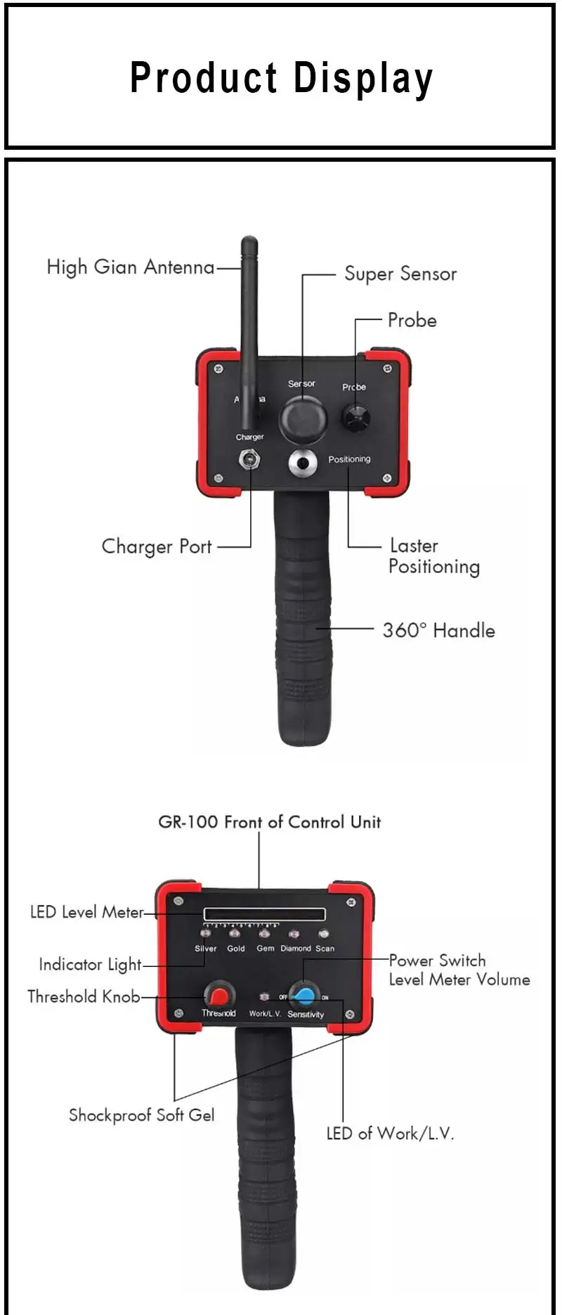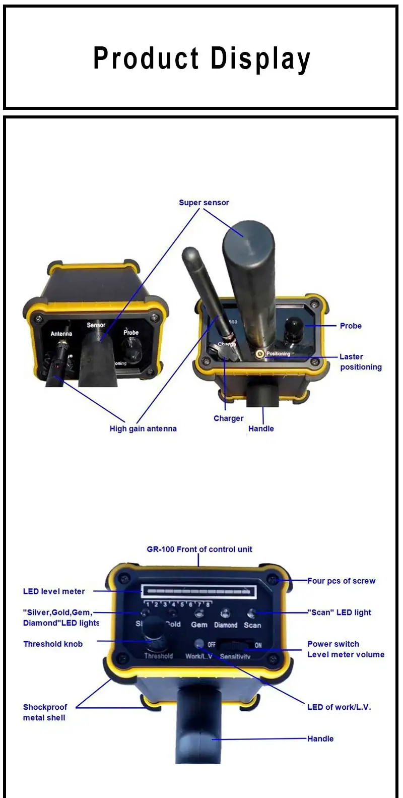 -Антенна (медь), складная в верхней части устройства в соответствии с антенной системы свободного движения, была Синтезирована и разработана, чтобы быть первым в мире и специалистом в раскрытии золотых самородков и золота, Серебро, драгоценный камень и катакомбы под поверхностью земли до глубины 30 метров и 1000 метров передо мной.