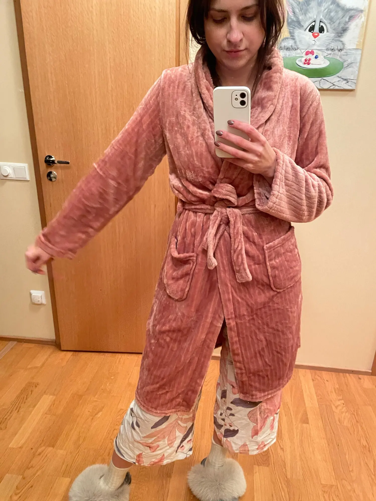 Заказ отправляли 3 раза и три якобы возврат с таможни. месяц я ждала отправки и движения посылки, после 3 возврата написала продавцу, что если 4 посылку Вам вернут обратно, возвращайте деньги. На тот момент было месяц после оплаты. 4 посылка шла 32 дня. В итоге ждала 2 месяца. Теперь о халате. Плюшевый. очень толстый. Размер L идет на 46-48. У меня 44 размер. Не такой как на фото ..какой то бесформенный и очень толстый плюш, как игрушки шьют плюшевые. Полностью толстая синтетика. Если бы увидела в живую, не купила бы... Вообще заказываю много на Али и давно, поэтому на практике в основном маломерки, поэтому заказала L. Очень много не нужных и не соответствующих о фото покупок. Мои параметры рост 165, ОГ 90-ОТ-64-ОБ-96 вес 55-56 кг. длина чуть ниже колена на 5 см, рукава длинные-ушью, плечи большие мне.
