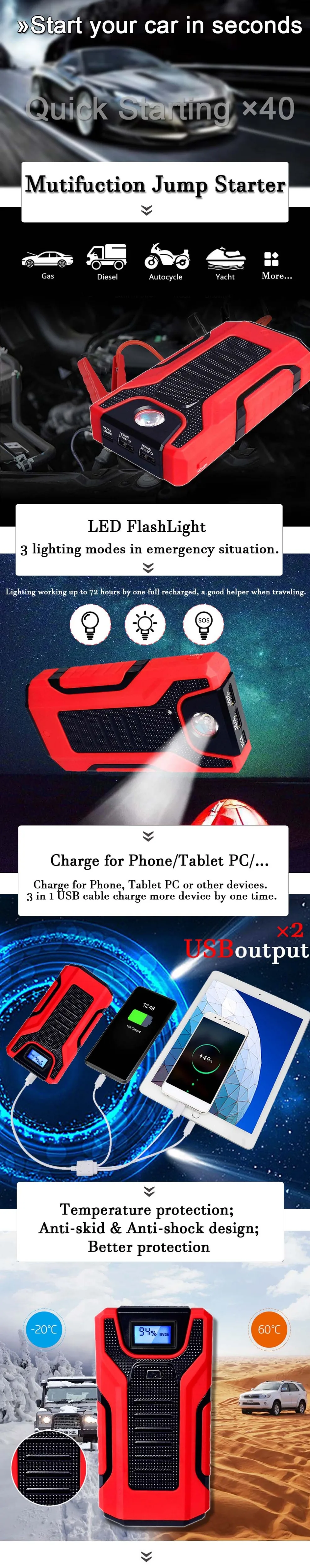 Обалденная штука. Коробочка шикарная, жёсткая, на молнии, обшита плотным материалом с крупным плетением, внутри широкие резинки и сеточка, держат провода и само устройство, короче, выглядит дорого-богато. Корпус сделан добротно, прорезиненный пластик, в руке не скользит, крокодилы и провода мощные. Юсб и фонарик работают. Завожу им утром авто с двигателем 1.8 (бензин) при температуре ниже -13, так сказать, помогаю, просто аккумулятор плохой и не хочу ждать пока он разрядится в ноль, чтоб потом не пришлось тащить на зарядку, с ним крутит бодро и времени занимает 2 минуты (достать, завести, обратно всё сложить). В комплекте разъём под прикуриватель, можно, например, компрессор для подкачки колёс подключить. Есть ещё провод юсб с разными штекерами, им и заряжаю устройство. Совет: когда откроете коробочку, сфотографируйте как всё уложено, потом проще всё обратно складывать будет. Доставка сдеком 10 дней. Взял красный, 11.11 с купонами вышло 2582 р. Покупкой очень доволен. Рекомендую!!!
