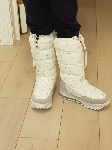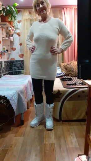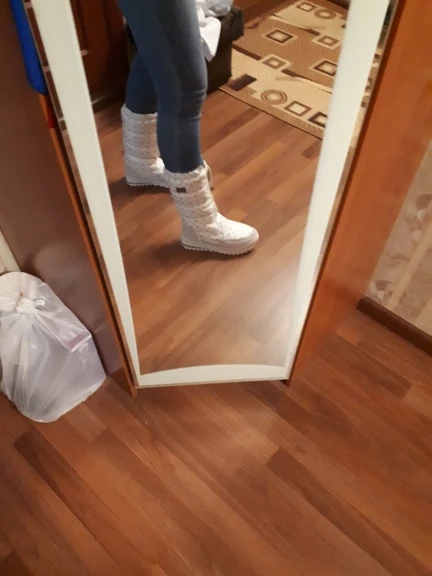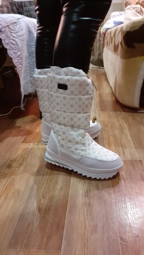 Дутики очень хорошие, тёплые, мягкие, легкие и аккуратные, сделаны из прочных материалов, которые в холод не лопаются, внутри мягкий мех, у меня 37 размер ног, купила 38, как раз , ещё для устойчивости подложила ортопедические стельки и сверху свои тёплые стельки, вообще супер стало, продавец в посылку вложила запасные тёплые стельки и маленький новогодний подарочек, очень приятно, спасибо, у нас похожие продают, но они не такие, а из каких-то химических материалов, берите если нужны, не пожалеете! И высота то, что надо!