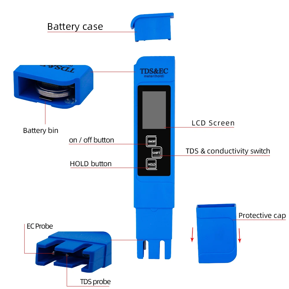 Обеспечивает точные и надежные показания теста:3-в-1 Цифровой TDS метр обеспечивает точные показания для TDS (всего растворенных твердых веществ) EC (электропроводность) и температуры. Профессиональный, точный и точный 3-в-1 TDS, EC и измеритель температуры воды. Измеритель TDS имеет автоматическую компенсацию температуры в режиме измерения. 9 минут без работы, счетчик автоматически отключится. Экономия энергии, увеличение срока службы батареи