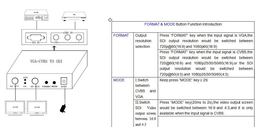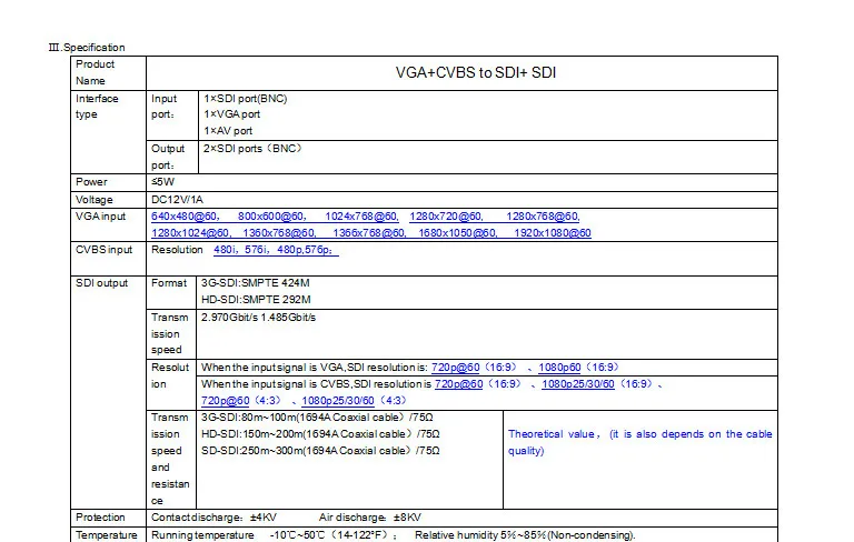 Этот продукт поддерживает вход сигнала VGA и AV, он также поддерживает 2 порта сигнала SDI(SD-SDI/HD-SDI/3G-SDI), поддерживает выход сигнала Full-HD SDI, он также очень прост в использовании с высокой стабильностью и надежностью. Он широко используется на всех ТВ-станциях и других рабочих местах, безопасном мониторинге безопасности, месте обучения и т. д.