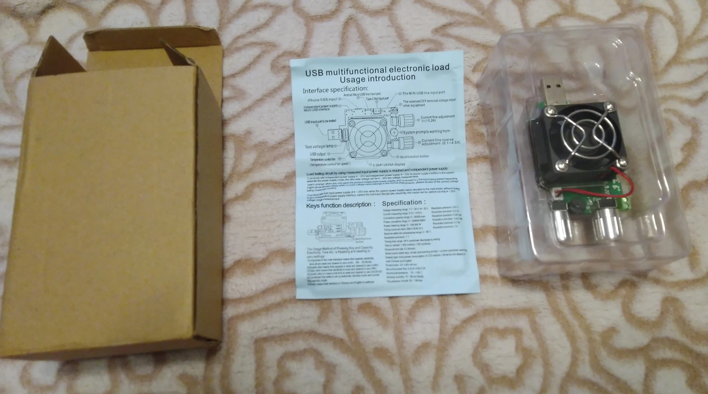 Доставка до Москвы 22 дня. Трек отслеживался до почтового отделения. Нагрузка работает, как заявлено. Пользоваться удобно, кроме основного разъёма USB присутствуют USB-C, mini USB, micro USB, Apple. Напряжение, ток, температура и др. Вентилятор включается и выключается автоматически, шумит не сильно. Инструкция на английском языке на одном листе. Упаковка добротная: коробка и пластиковый ложемент. Сервисом магазина доволен, продукт качественный, соответствует описанию.