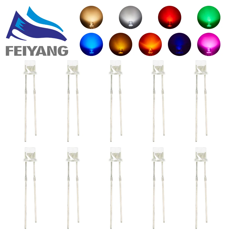 Светодиодная широкоугольная лампа с плоским верхом, 100 шт., 3 мм, 2 контакта, белый, красный, желтый, синий, зеленый
