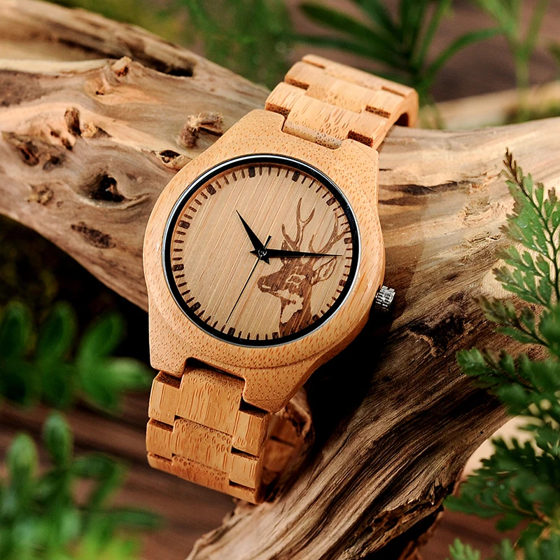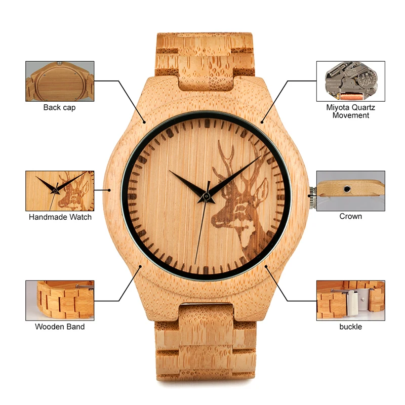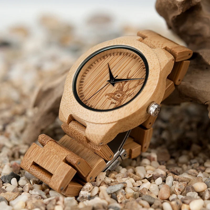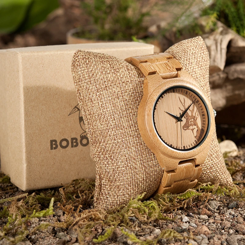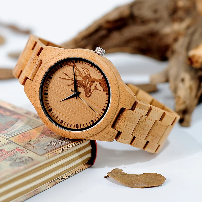Часы BOBOBIRD D28 из натурального бамбука с гравировкой головы оленя, циферблат с бамбуковым ремешком в подарок