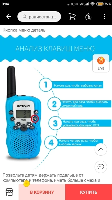 Всегда хотелось что-то необычное заказать сыночку Я наткнулась на магазин раций RETEVIS Official Store , в которые можно играть мамам с детьми. Хочу отметить: ОЧЕНЬ БЫСТРАЯ ДОСТАВКА ЗВУК ХОРОШИЙ СЛЫШНО ПРЕКРАСНО ФОНАРИК ЛОВИТ ПО ВСЕЙ КВАРТИРЕ Нужно много батареек, 4 батарейки ААА. Очень довольна товаром, качество на высоте. Красивые и удобные рации Очень советую продавца.