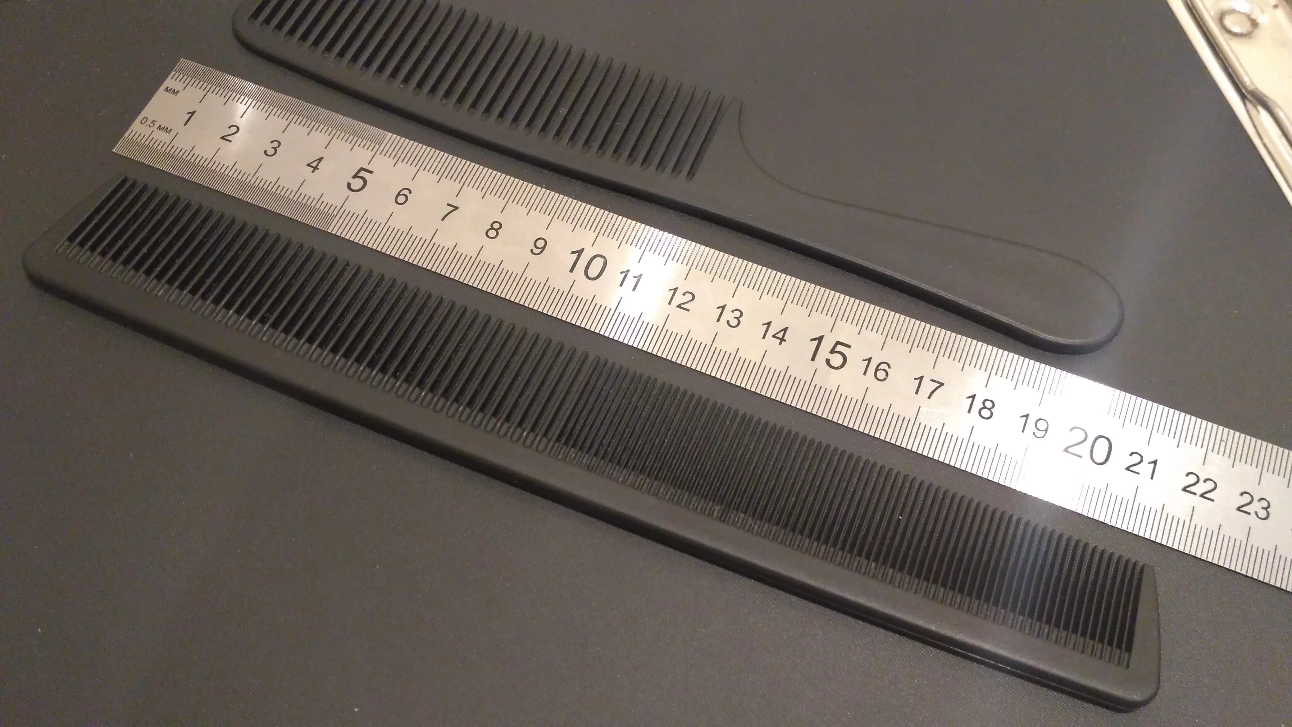 Расчески неплохие . Не слишком тонкие, но и не слишком толстые. Литье качественное, косяков в исполнении нет. Брендинг нанесен, но после пары моек с мылом надписи почти смылись. Длинная расческа понравилась больше, хорошо ложится в крупную руку.