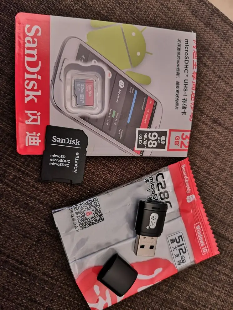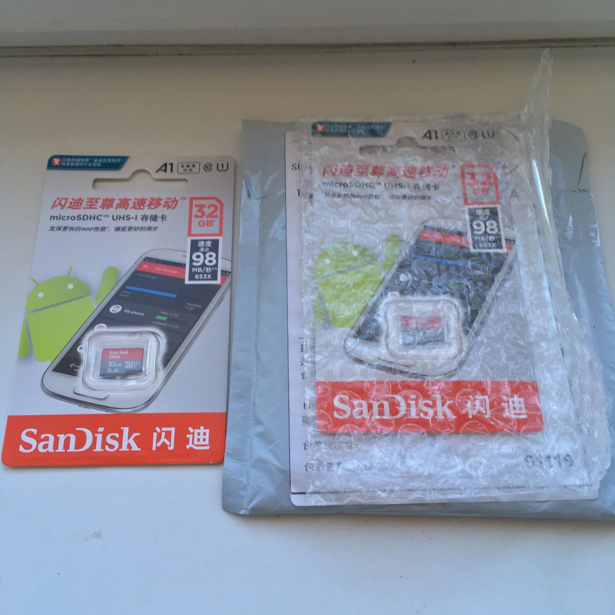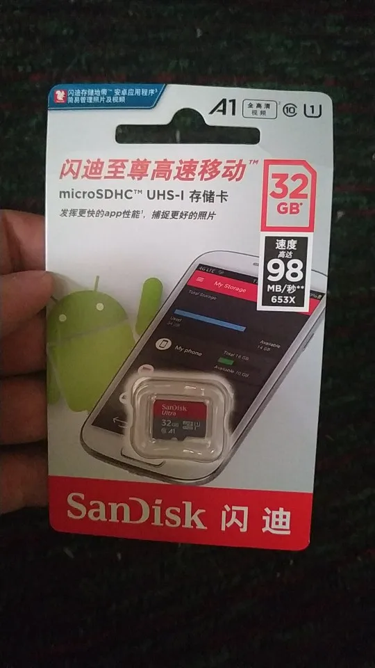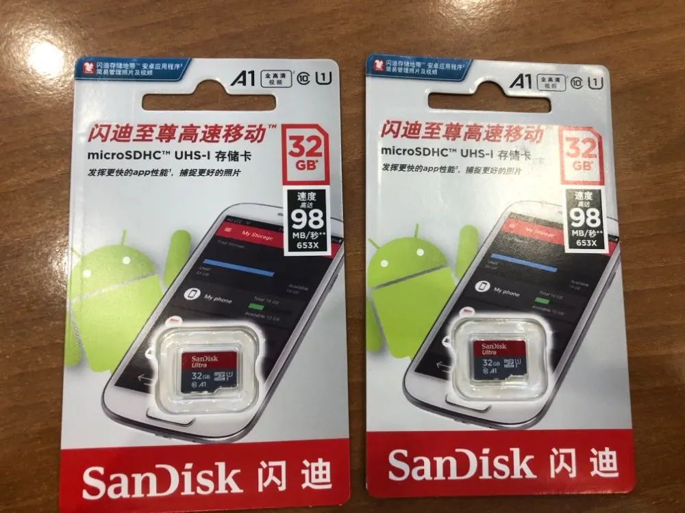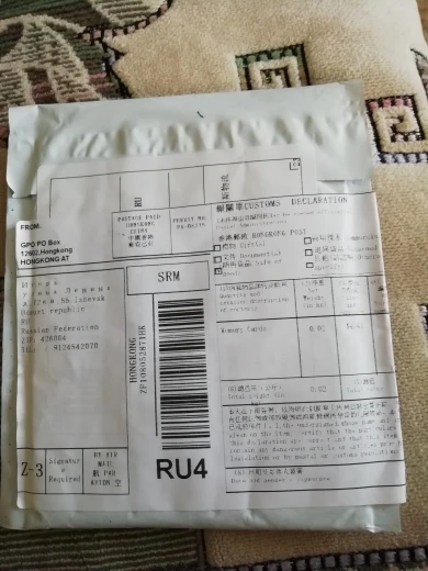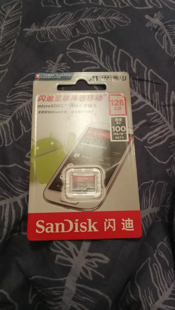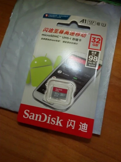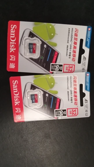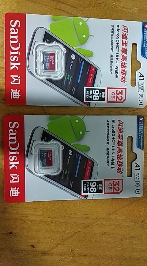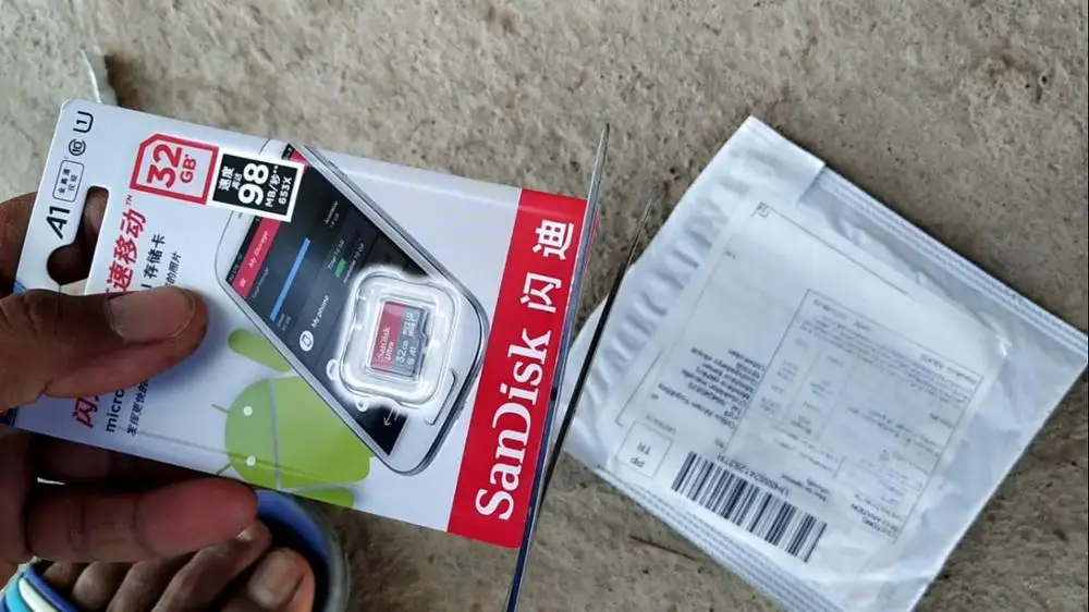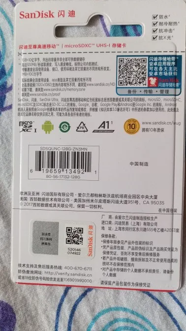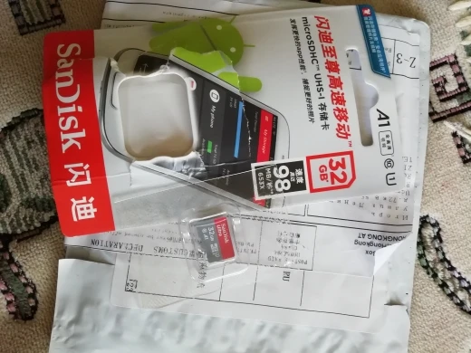 Посылка пришла через 24 дня, в упаковке пупырчатый пакетик и в нём карты памяти в фирменной упаковке. QR-код на упаковке под защитным покрытием позволяет проверить на сайте verify.sandisk.cn подлиннось карт памяти. В смартфоне тест показывает скорость записи 11.2 МБ/сек и скорость чтения 68.7 МБ/сек. В общем, хорошие карты памяти, заказываю их второй раз.