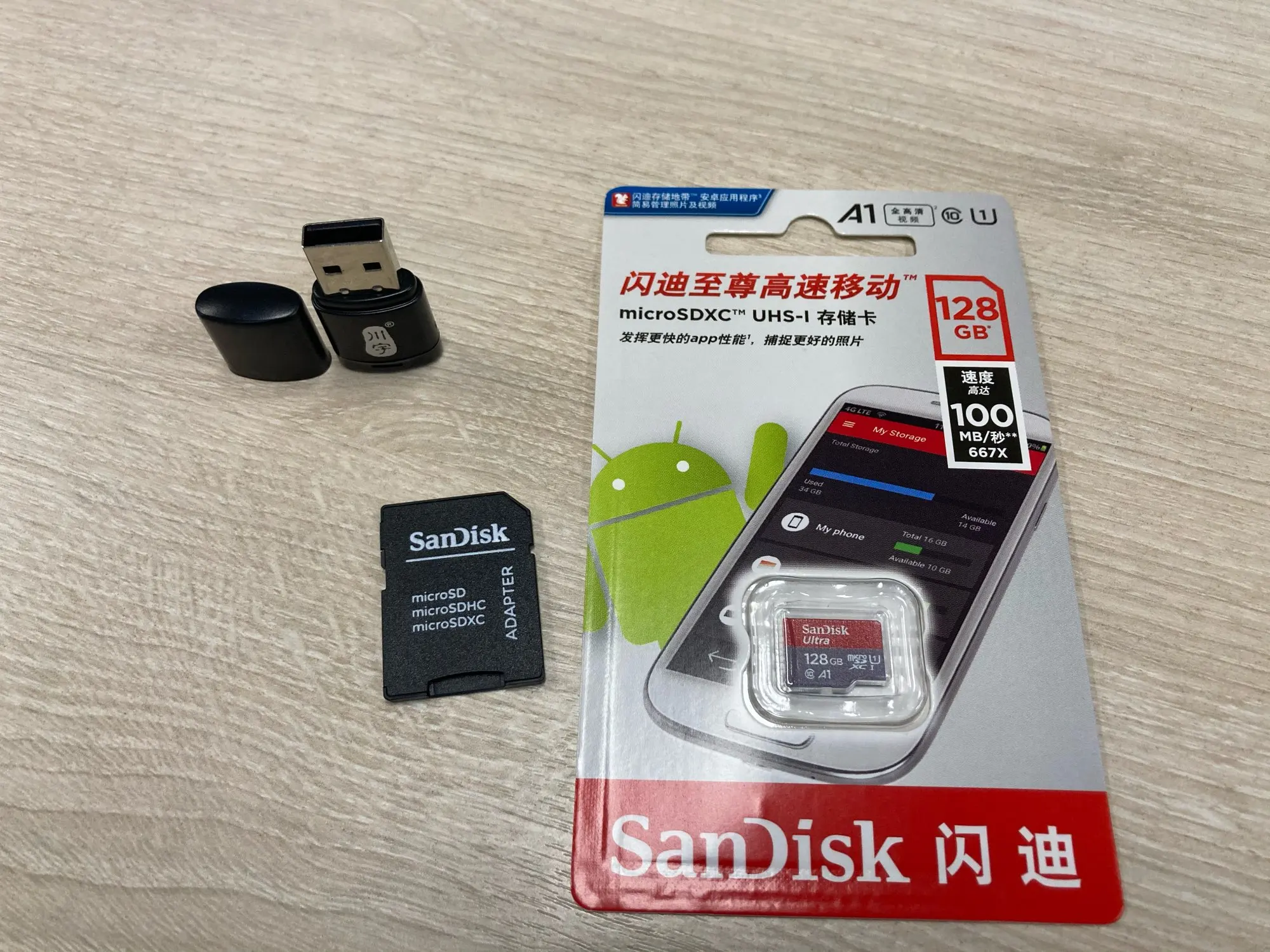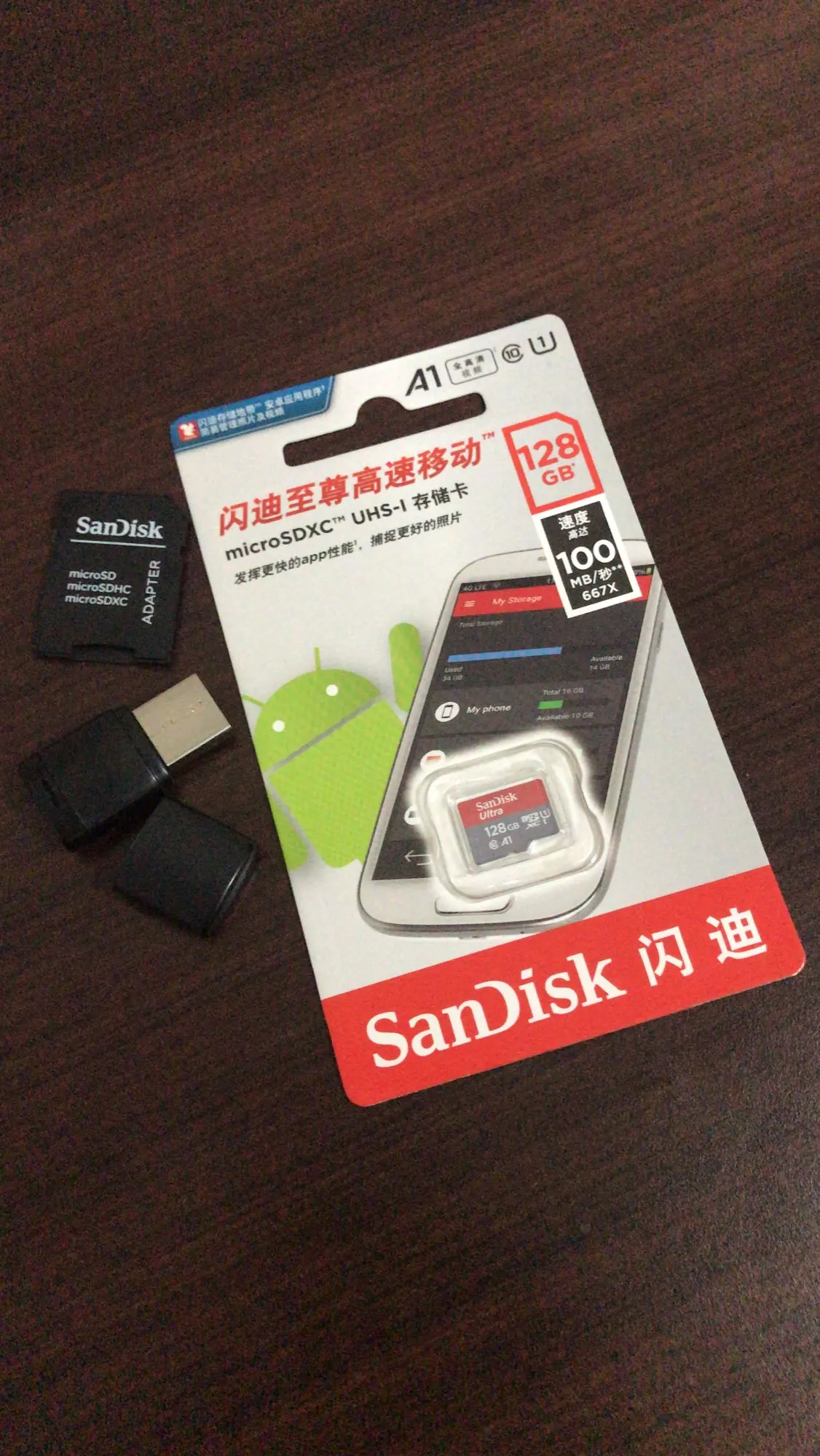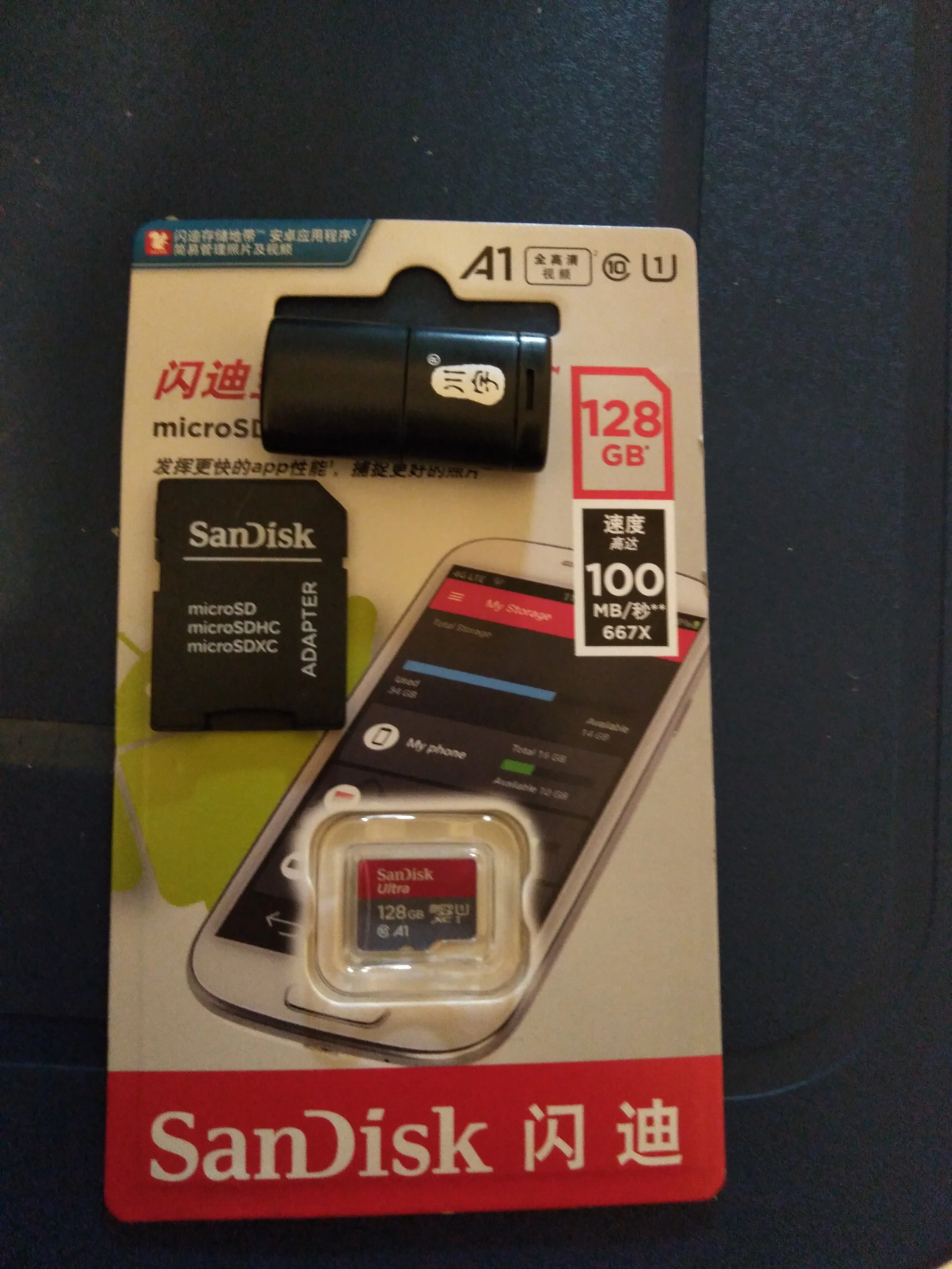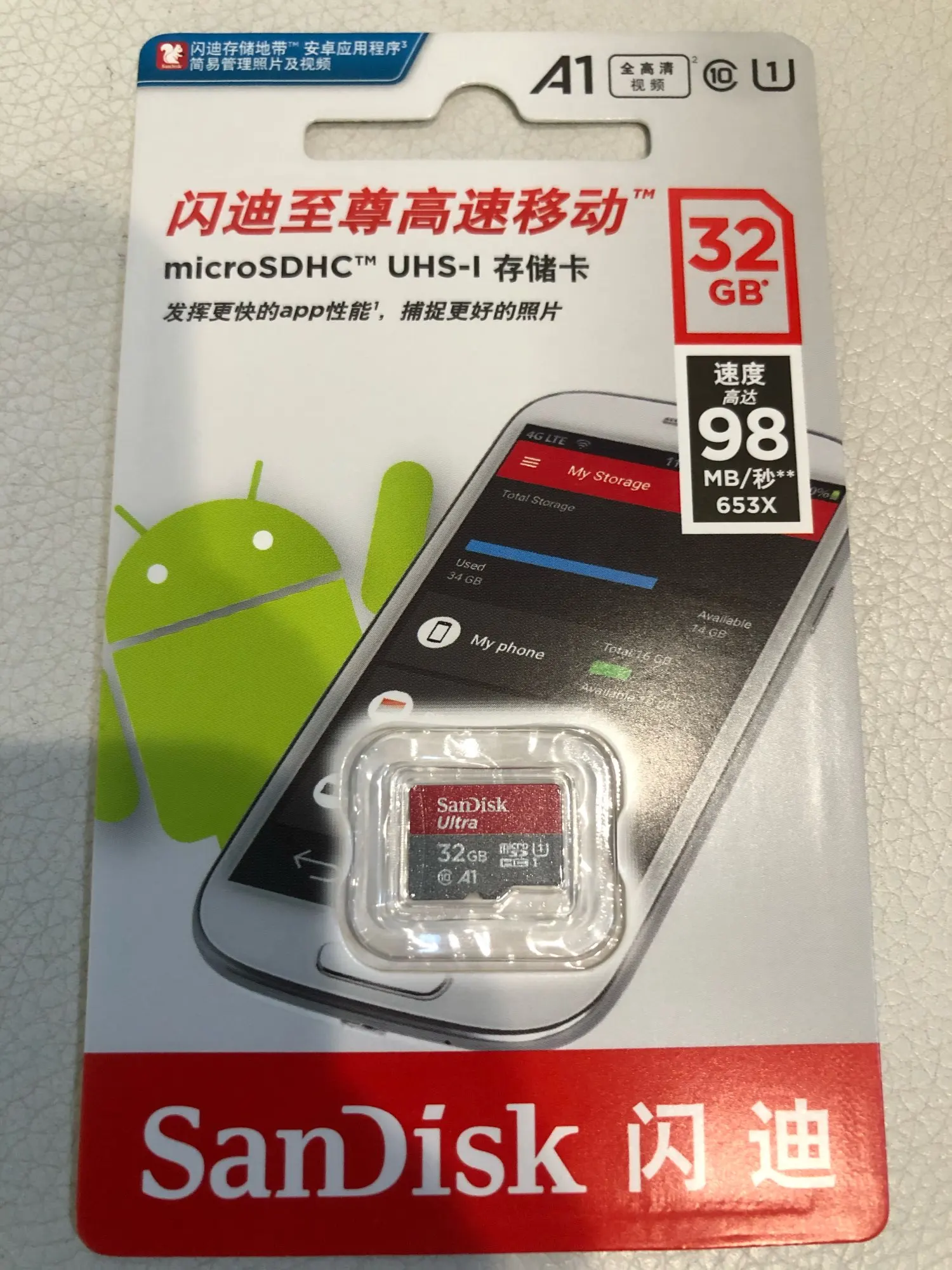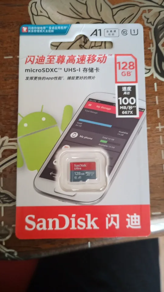 Посылка пришла через 24 дня, в упаковке пупырчатый пакетик и в нём карты памяти в фирменной упаковке. QR-код на упаковке под защитным покрытием позволяет проверить на сайте verify.sandisk.cn подлиннось карт памяти. В смартфоне тест показывает скорость записи 11.2 МБ/сек и скорость чтения 68.7 МБ/сек. В общем, хорошие карты памяти, заказываю их второй раз.