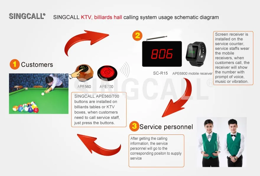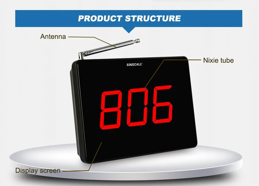 Беспроводная система вызова широко используется в области обслуживания. Это кнопка для использования гостем. Когда гость нуждается в какой услуге, он или она просто нажмите кнопку рядом с ним, его или ее номер стола будет отображаться в музыки или смотреть пейджер предупреждающий голос. Поэтому официант может обеспечить очень своевременное обслуживание. Это делает общение с гостями простым и эффективным. Добро пожаловать на выбор устройства беспроводной системы вызова.