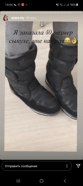 Сапоги понравились всем: материалом, цветом, размером. мех приятный, не тонкий. Брала 38р. на вырост. Без носков одевается на 39. не маломерят. продавцу большое спасибо за подарочки- запасные стельки и сувенир! минус-пришли на 35 дней позже крайнкго срока...зима на исходе