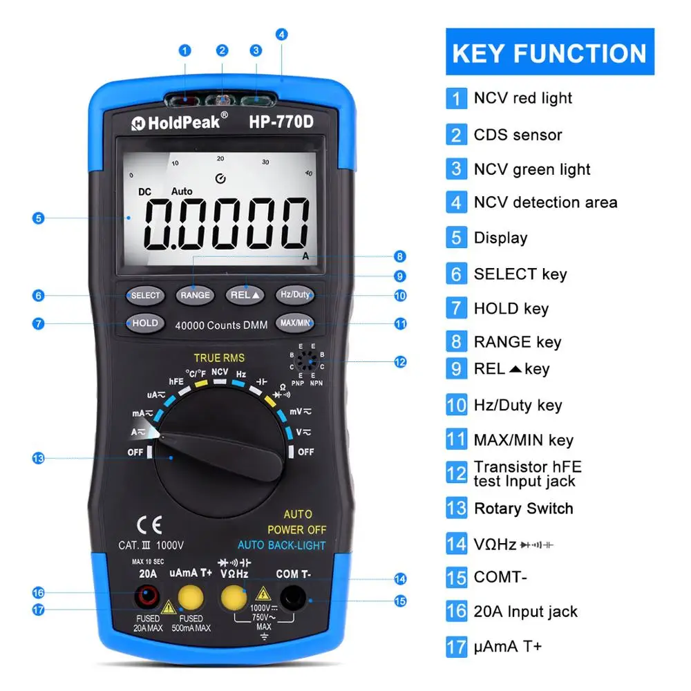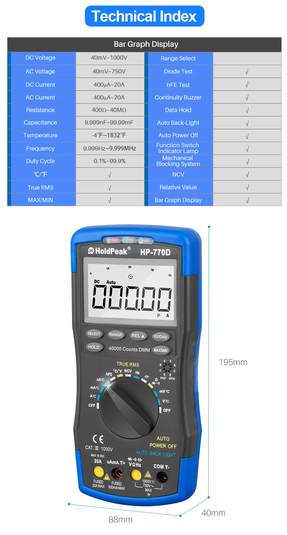 Преимущества: 1. Точный 2. Автоматический свет 3. Углы размещения (0, 15, 30, 40). Магнит. Можно повесить. 4. Чехол хорошо подходит 5. Быстрая доставка со склада в России Недостатки: 1. Медленный (задержка) Звуковой тест непрерывности 2. Не может измерять падение напряжения белых светодиодов 3. Низкая контрастность экрана, когда смотрите сверху 4. Странные измерения в режиме hFE 5. Невозможно выключить, когда зонд в слоте uA/T Размер 88*193*45 мм. Высота цифр-17 мм. Тело не скользит, может быть размещено в разных позициях. Углубления по бокам удобны для фиксации устройства на коленях. Тело не очень крепкое. Зонды хорошие. На иглах нет изоляторов. Трудно вытянуть зонды одной рукой. Измерения хорошо сочетаются с другими мультиметрами в режимах V, I, R. Режим C показывает немного различные результаты на всех моих мультиметрах. Режим NVC часто не может найти провода в стенах. Измеряет DC и AC компоненты смешанного сигнала независимо. Датчик температуры имеет массивную трубу. Устройство использует 6*32 мм предохранители. Продавец отправил мне простой мультиметр в подарок.