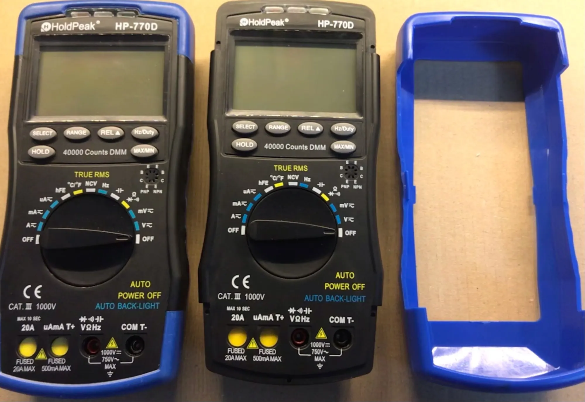 Электрически все хорошо с измерителем, и на этот раз я также получил один с «хорошим» чехлом. Этот чехол (с правой стороны) имеет настоящий силиконовый рукав, и чехол немного не пищит. С левой стороны вы можете увидеть мой первый, теперь приклеены. Однако наиболее важная часть-добавить немного ленты в отсек батареи/предохранителя.