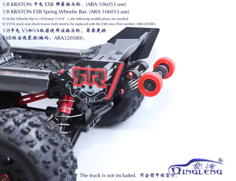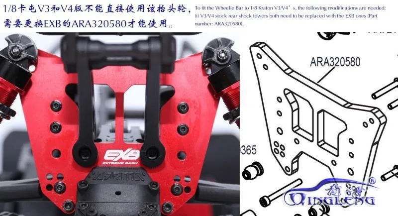 Напоминание: чтобы соответствовать колесной планке до 1/8 Kraton V3/V4, необходимы следующие изменения:Задние ударные башни V3/V4 должны быть заменены на EXB или v5 (номер детали: ARA320580 , ARA8608V5).