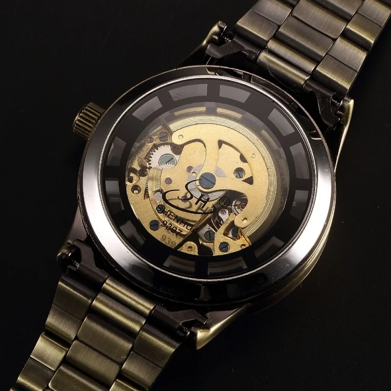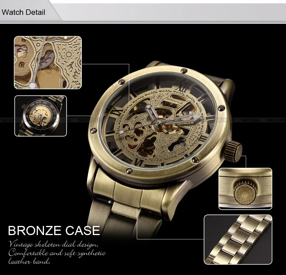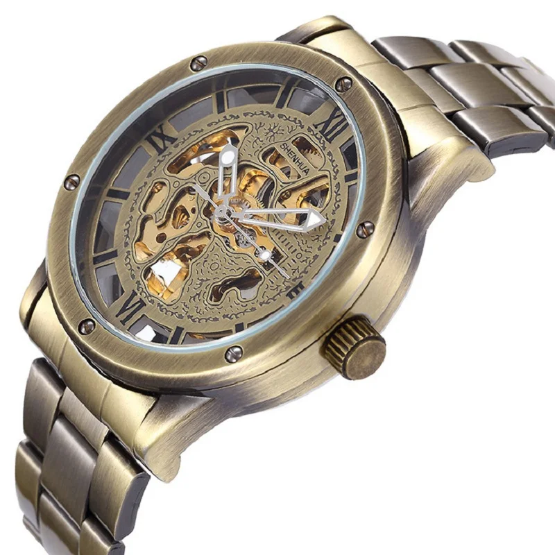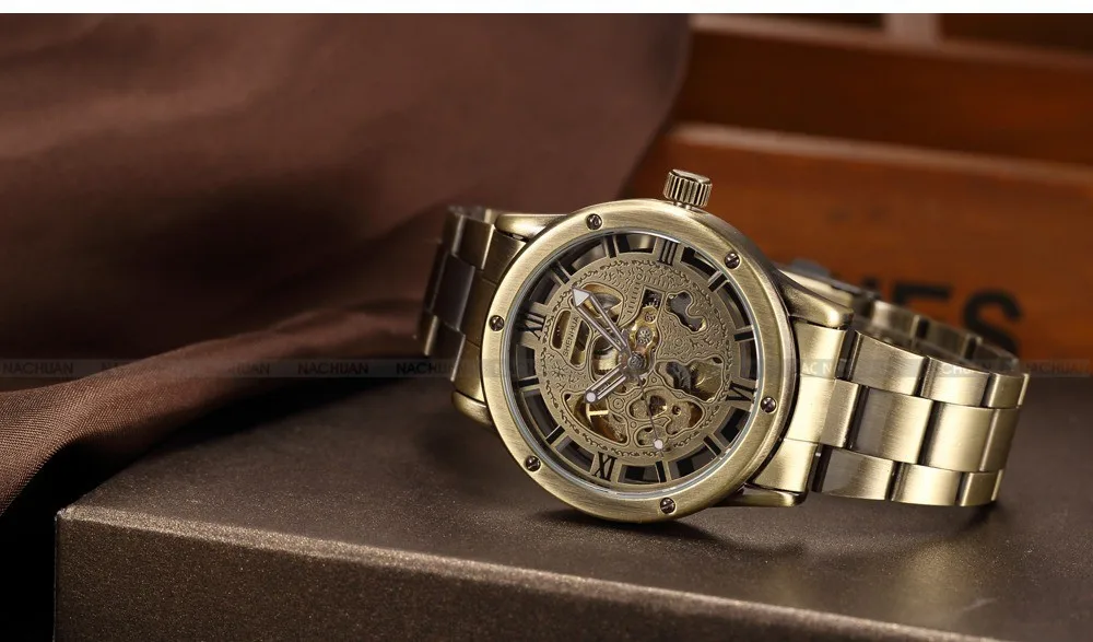 Часы наручные мужские механические Автоматические, брендовые винтажные бронзовые в античном стиле, со скелетом, полностью из нержавеющей стали
