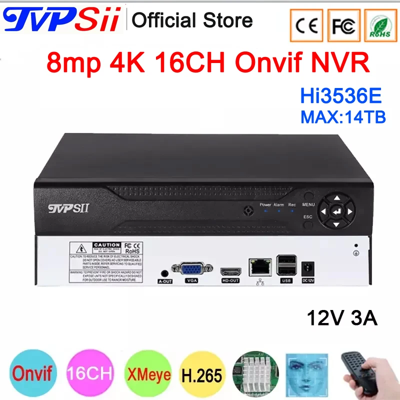 Система видеонаблюдения 12 В, 3 А, Hi3536E, Auido, H.265 + 8 Мп, 4K, 16 каналов