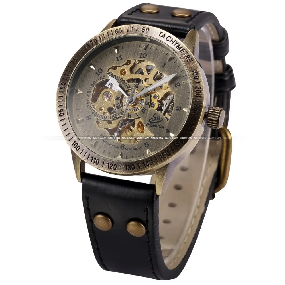 Часы-скелетоны Мужские механические, винтажные, бронзовые, с автоподзаводом, с кожаным ремешком, бренд Shenhua