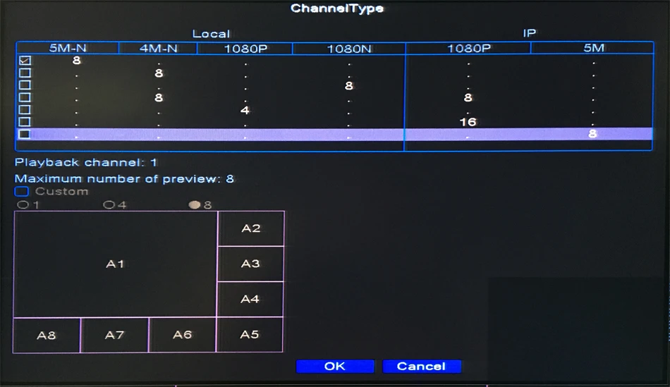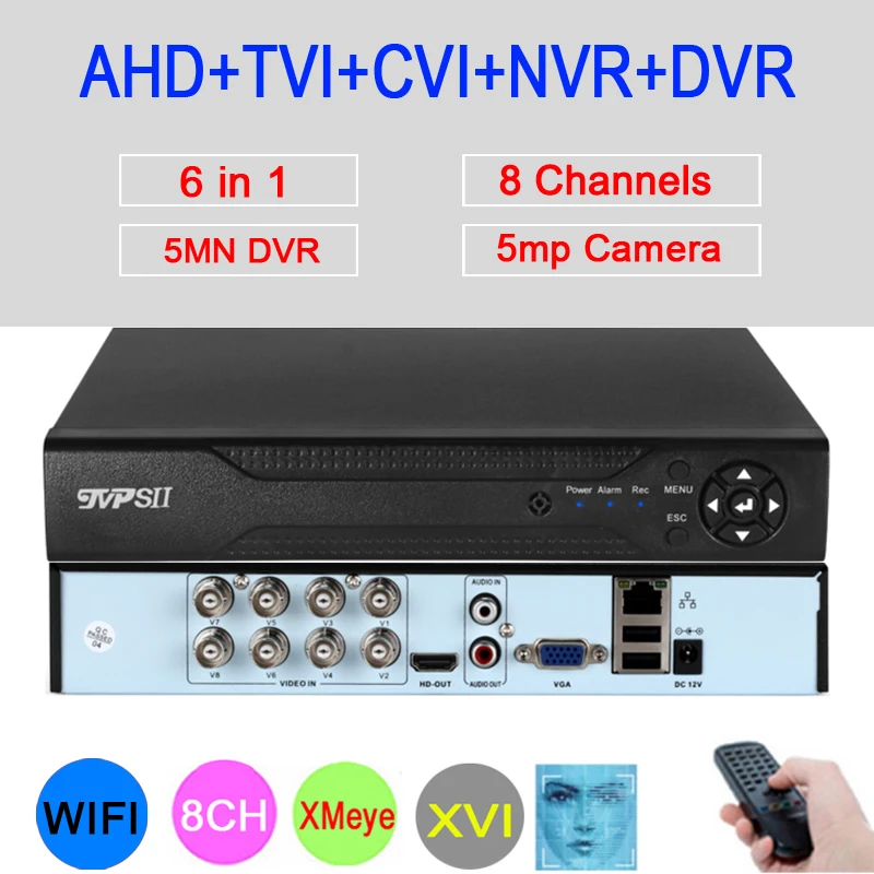 Это 5MN 8CH AHD CCTV DVR, он может поддерживать 5mp ahd камеру, но нужно установить камеру под 12.5fps.